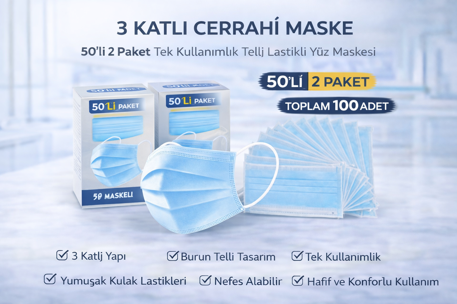 3 katlı cerrahi maske 100 adet, cerrahi maske 50 li 2 paket, tek kullanımlık maske, telli cerrahi maske, lastikli cerrahi maske, medikal maske, yüz maskesi 3 katlı, disposable cerrahi maske, hijyenik maske 100 adet, günlük kullanım maskesi
