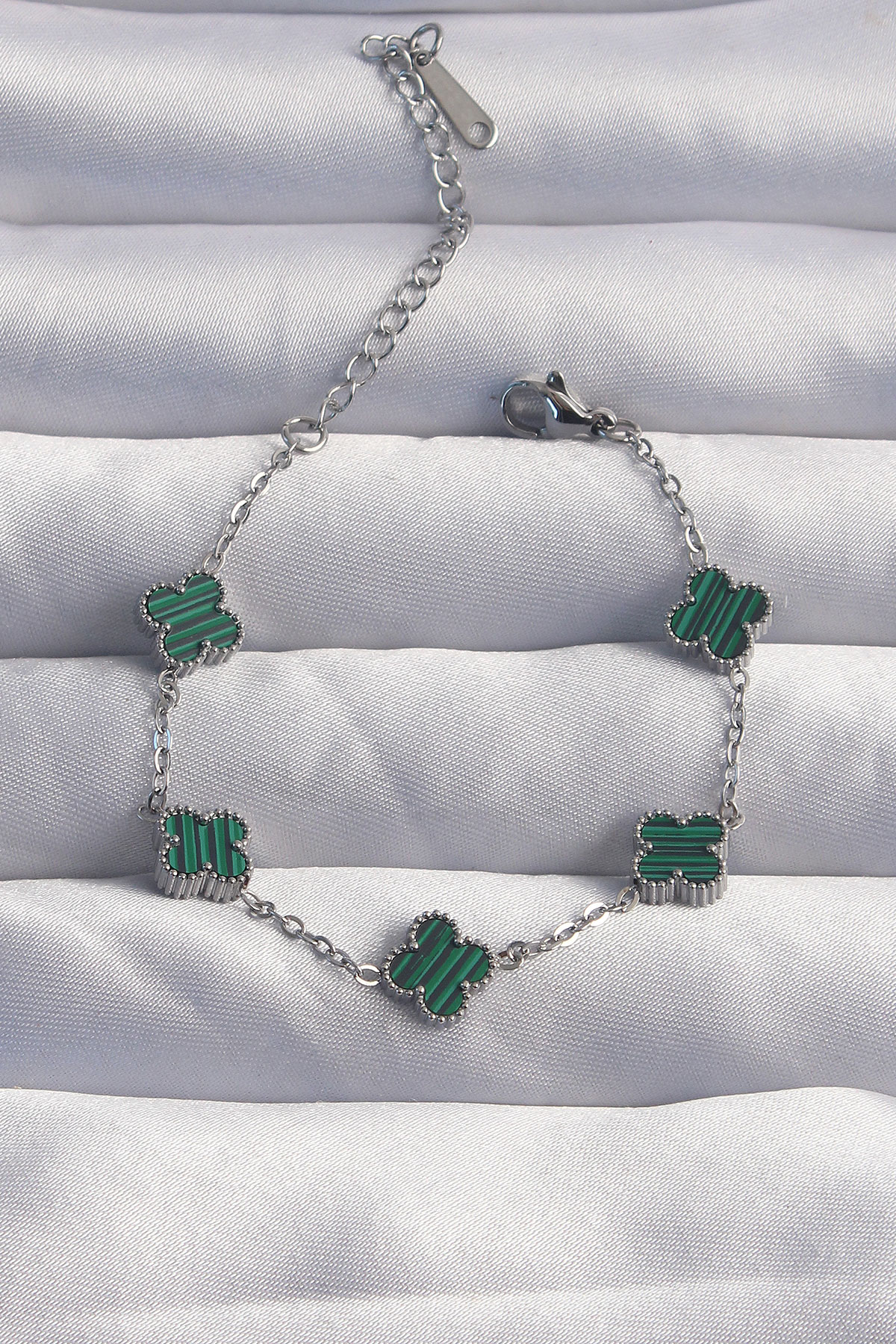 316L Çelik Baby Boy Gümüş Renk Çizgili Yeşil Mineli Yonca Bileklik