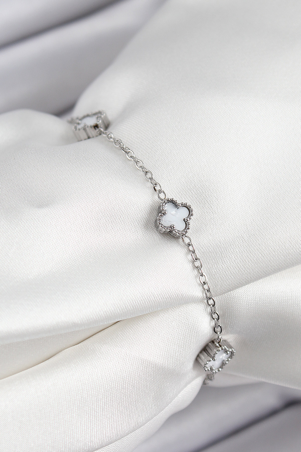 316L Çelik Beyaz Sedef Yonca Model Gümüş Renk Kadın Bileklik