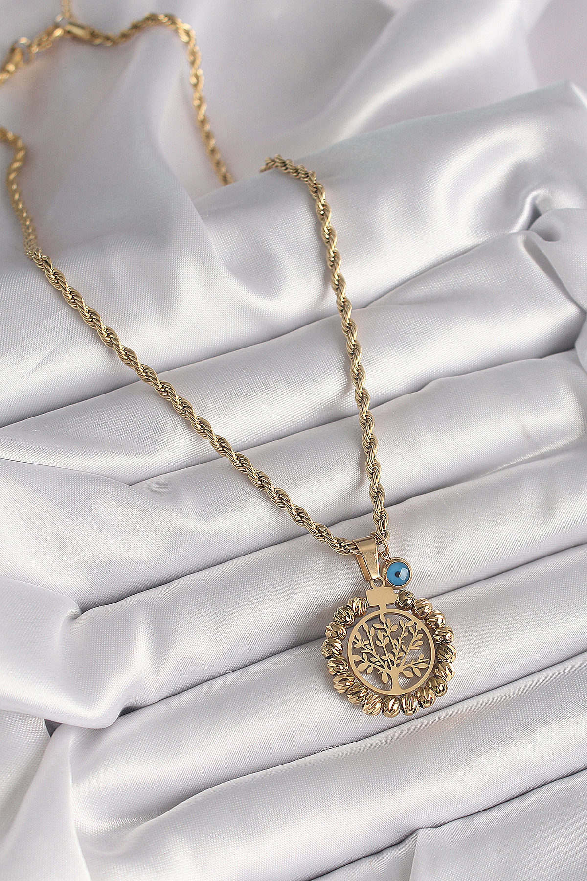 316L Çelik Gold Renk Burgu Zincir Dorika Yaşam Ağacı Figür Nazar Boncuk Detay Kadın Kolye