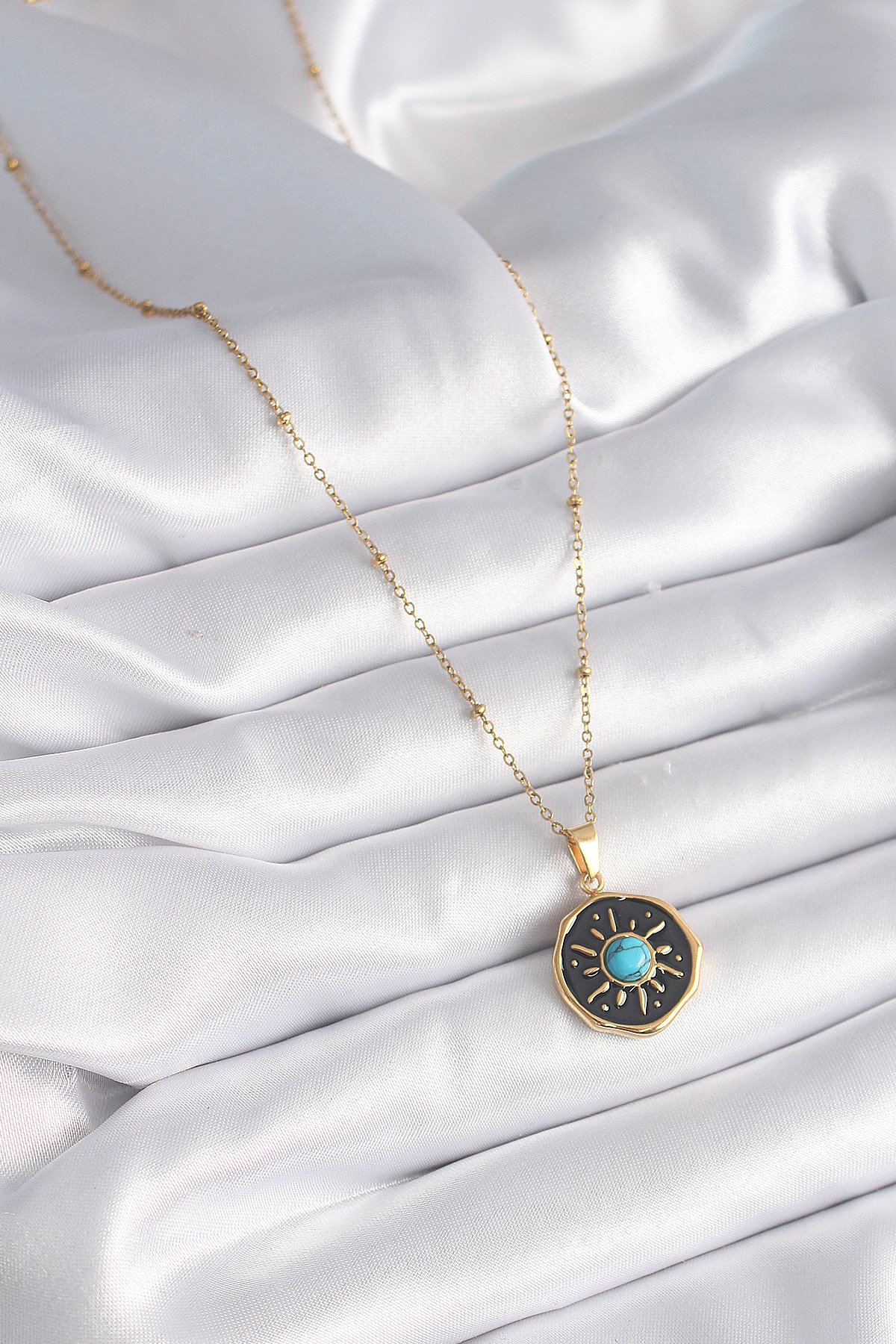 316L Çelik Gold Renk Mavi Boncuk Güneş İşleme Madalyon Model Kadın Kolye