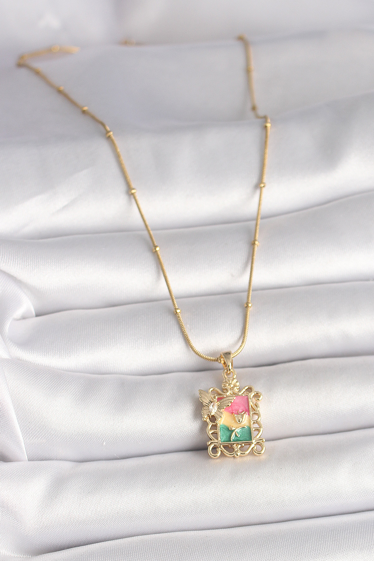 316L Çelik Gold Renk Renkli Zirkon Taşlı Kelebek İşlemeli Portre Model Kadın Kolye
