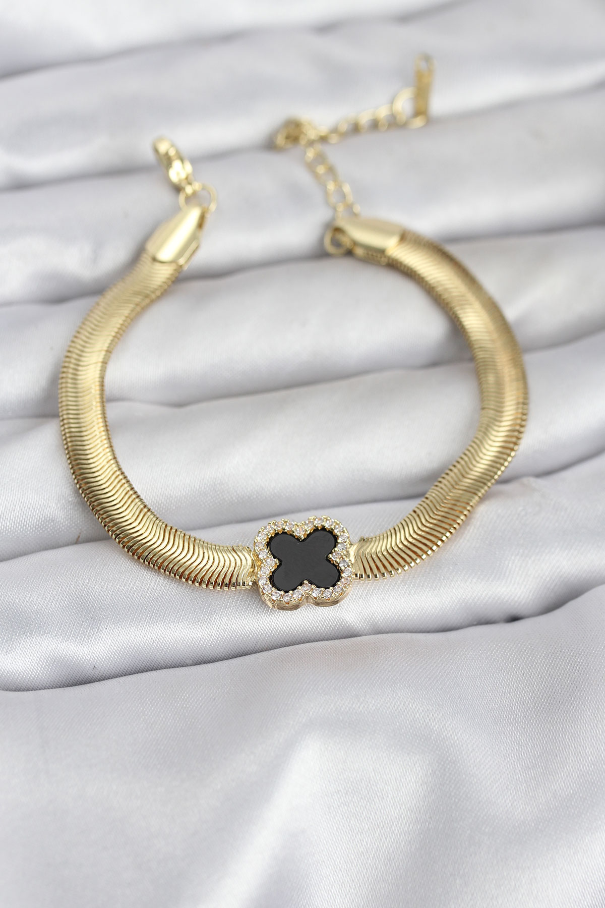316L Çelik Gold Renk Siyah Yonca Model Zirkon Taşlı Yılan Zincirli Kadın Bileklik
