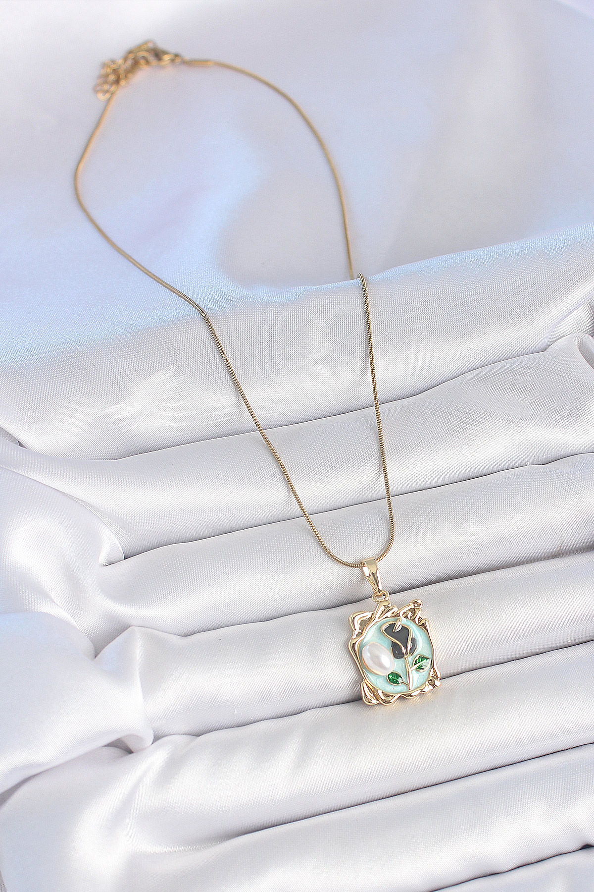316L Çelik Gold Renk Zincir Mavi Mineli Çiçek İşlemeli İnci Detay Portre Model Kadın Kolye