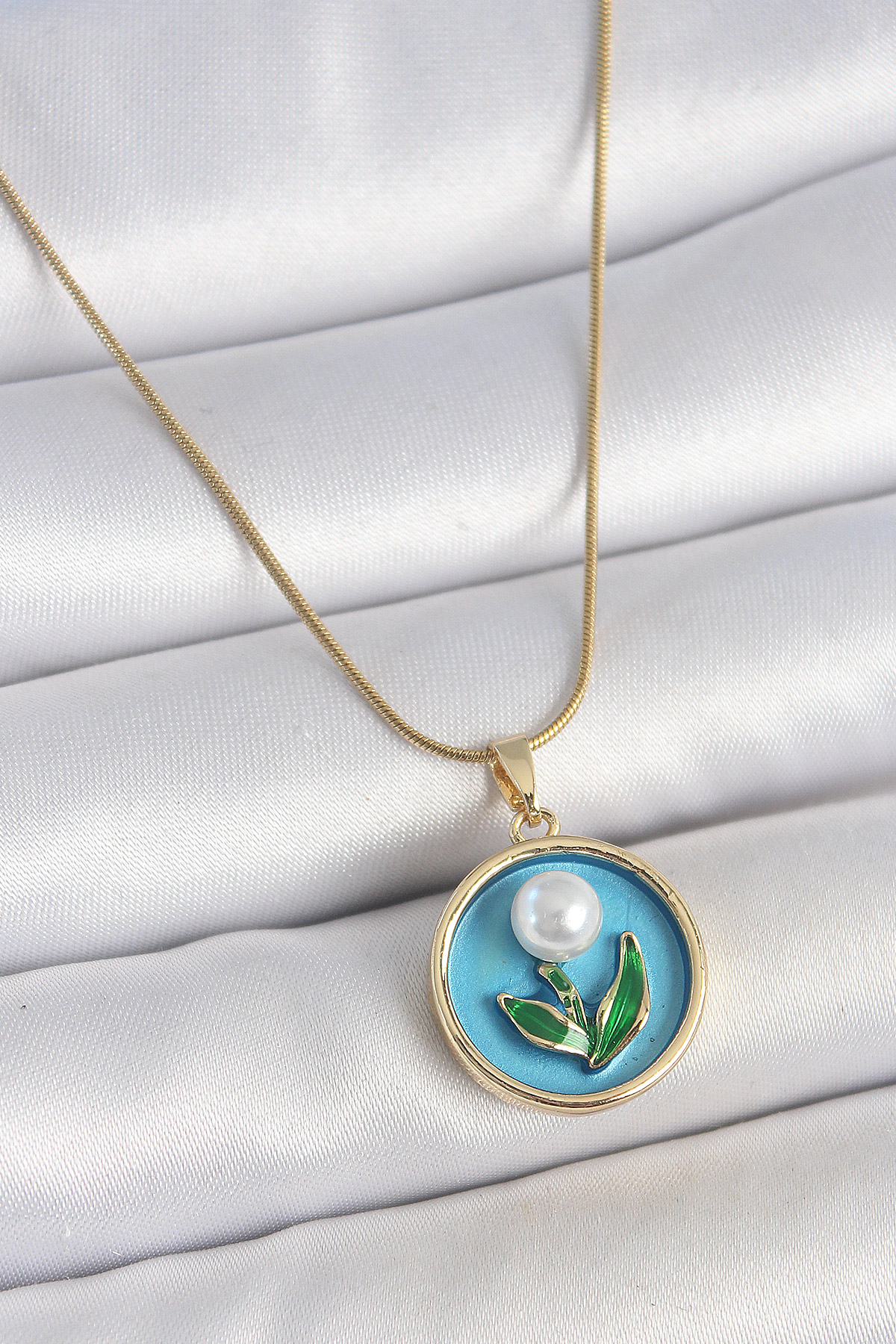 316L Çelik Gold Renk Zincir Mavi Mineli İncili Çiçek İşlemeli Portre Model Kadın Kolye