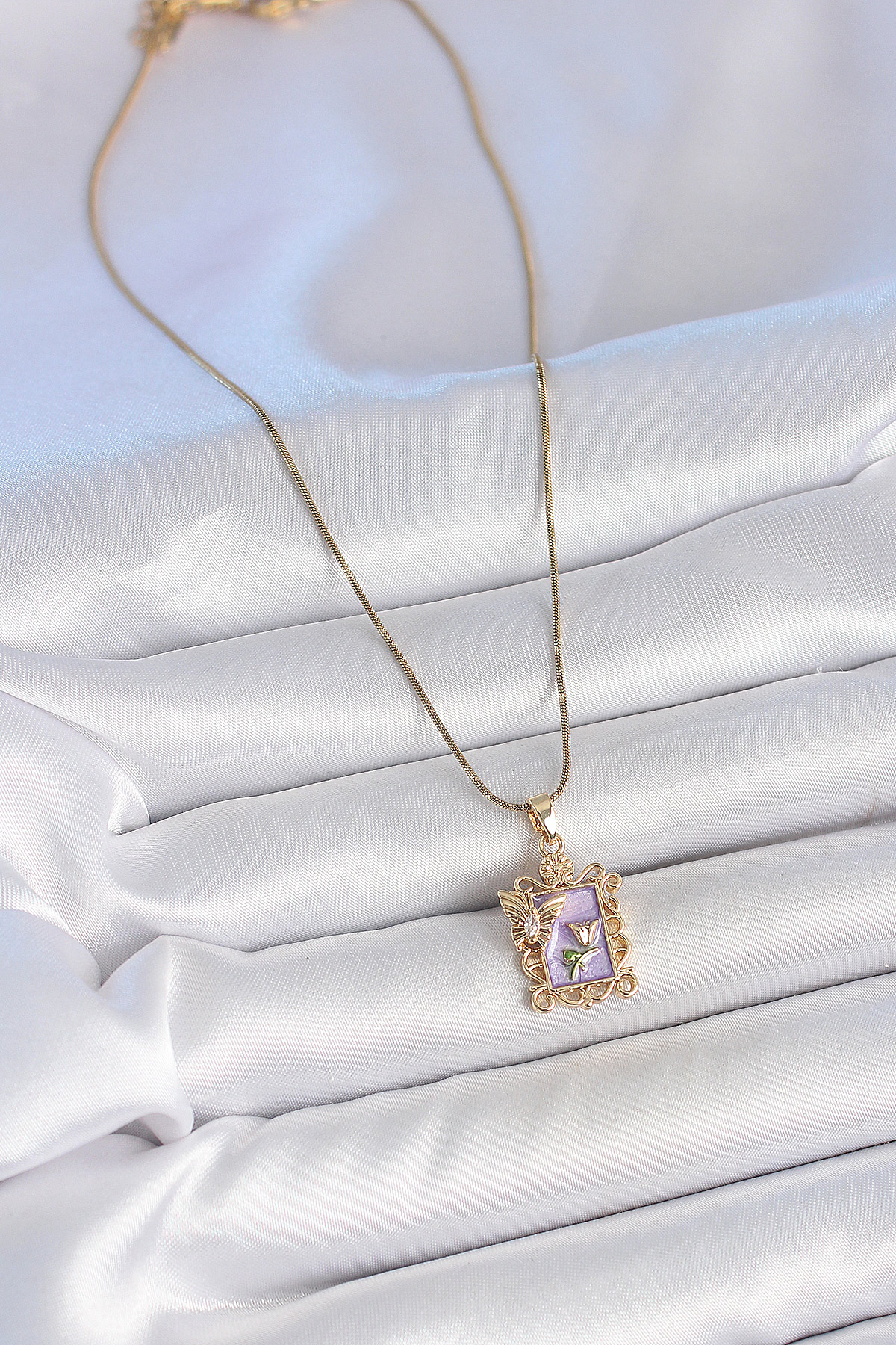 316L Çelik Gold Renk Zincir Mor Mineli Çiçek İşlemeli Zirkon Taşlı Kelebek Detay Portre Model Kadın Kolye