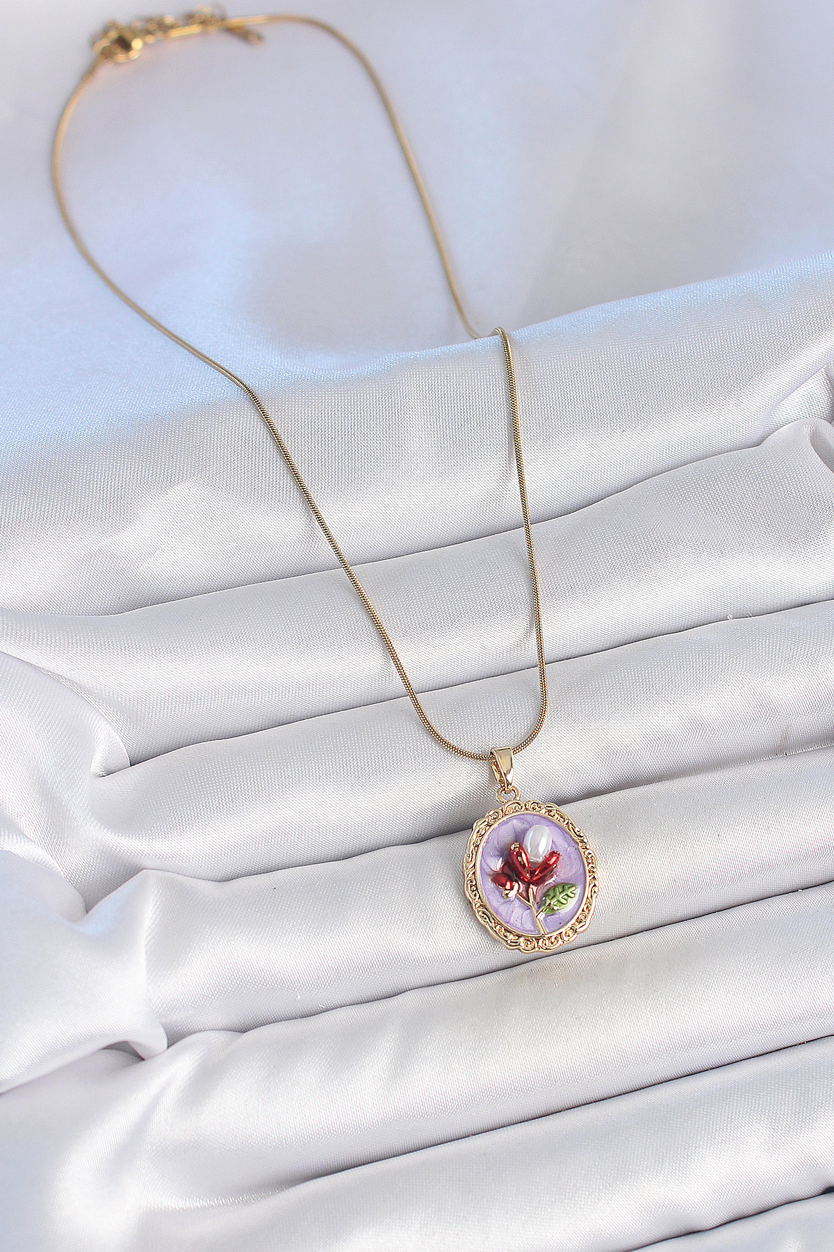 316L Çelik Gold Renk Zincir Mor Mineli İncili Çiçek İşlemeli Portre Model Kadın Kolye