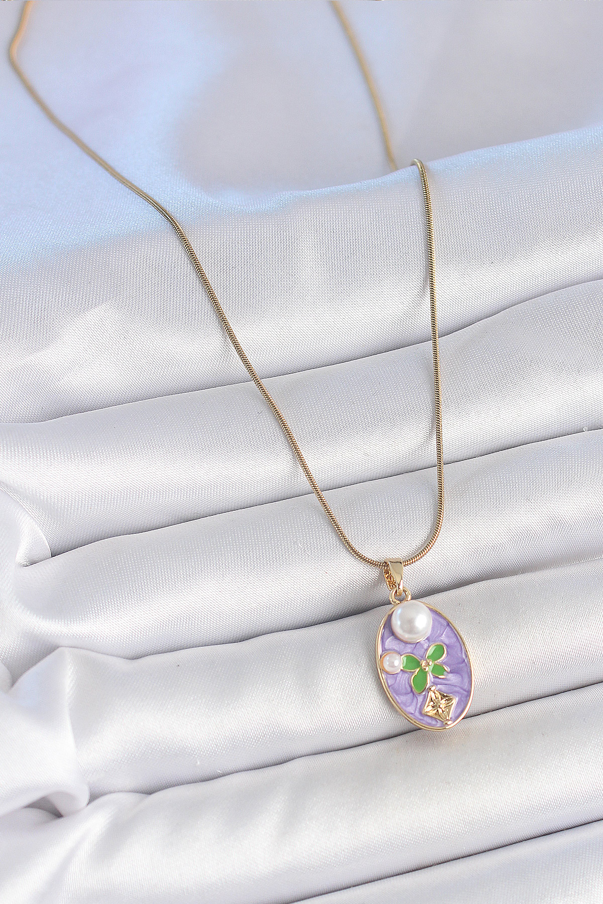 316L Çelik Gold Renk Zincir Mor Mineli Oval İncili Çiçek İşlemeli Portre Model Kadın Kolye