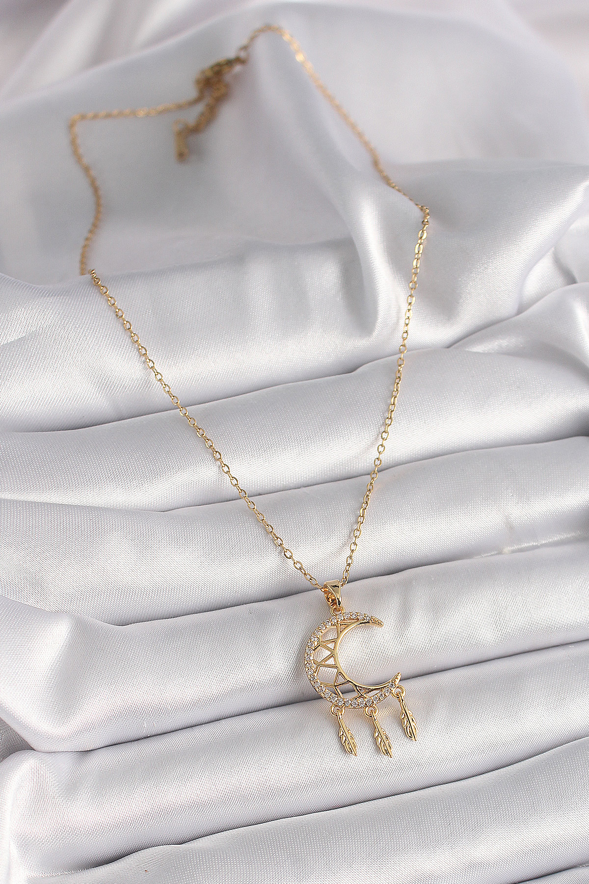 316L Çelik Gold Renk Zincir Zirkon Taşlı Hilal Model Sallantı Yaprak Detay Kadın Kolye