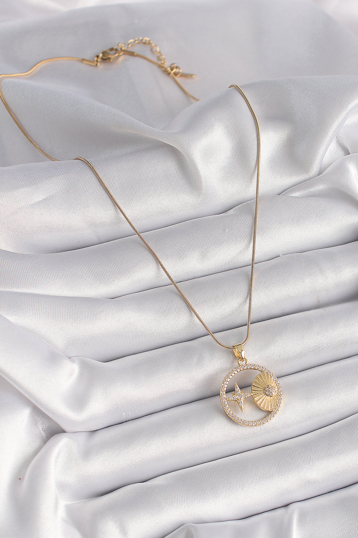 316L Çelik Gold Renk Zincir Zirkon Taşlı Yıldız İşleme Madalyon Model Kadın Kolye