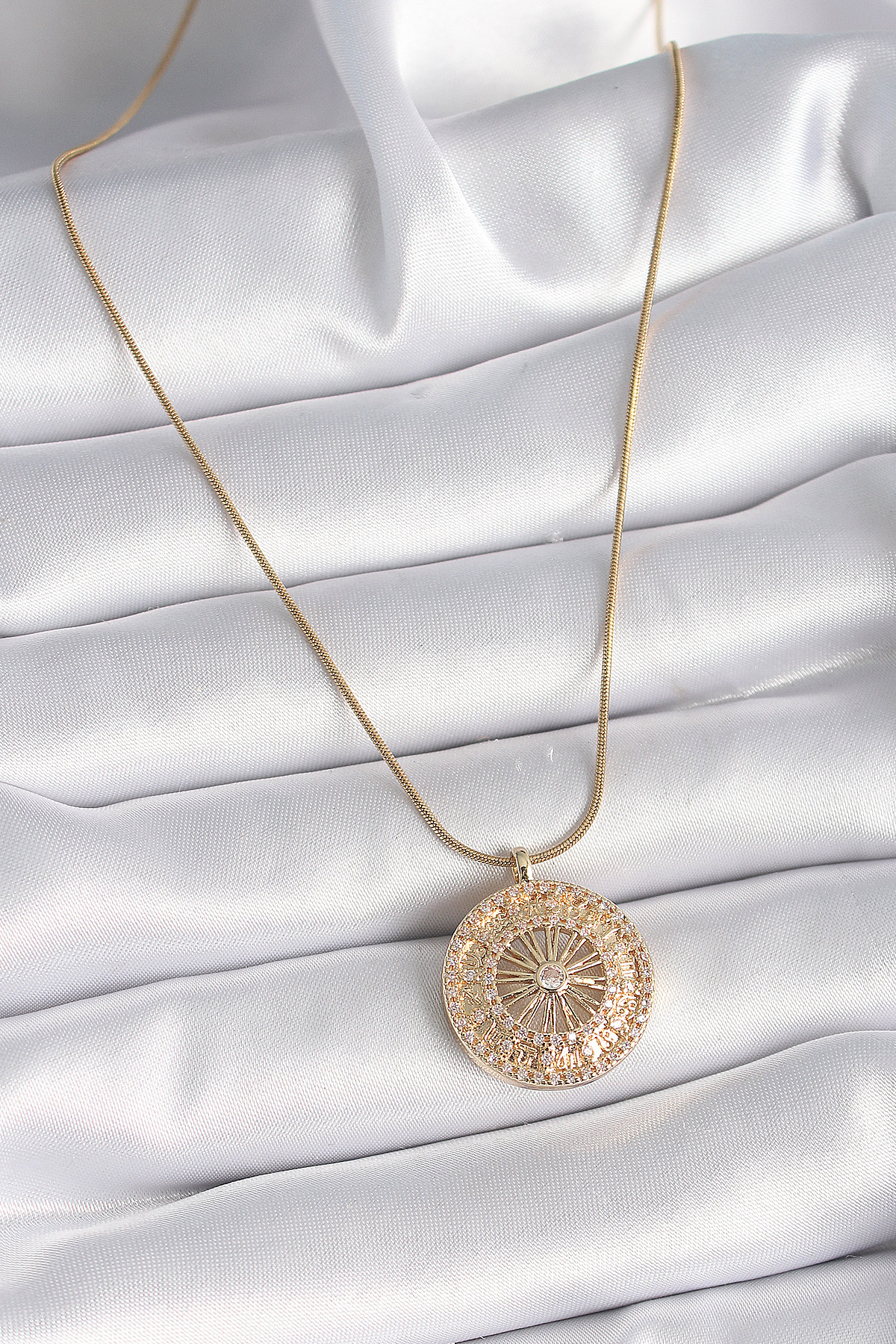 316L Çelik Gold Renk Zirkon Taşlı 12 Burç Madalyon Model Kadın Kolye