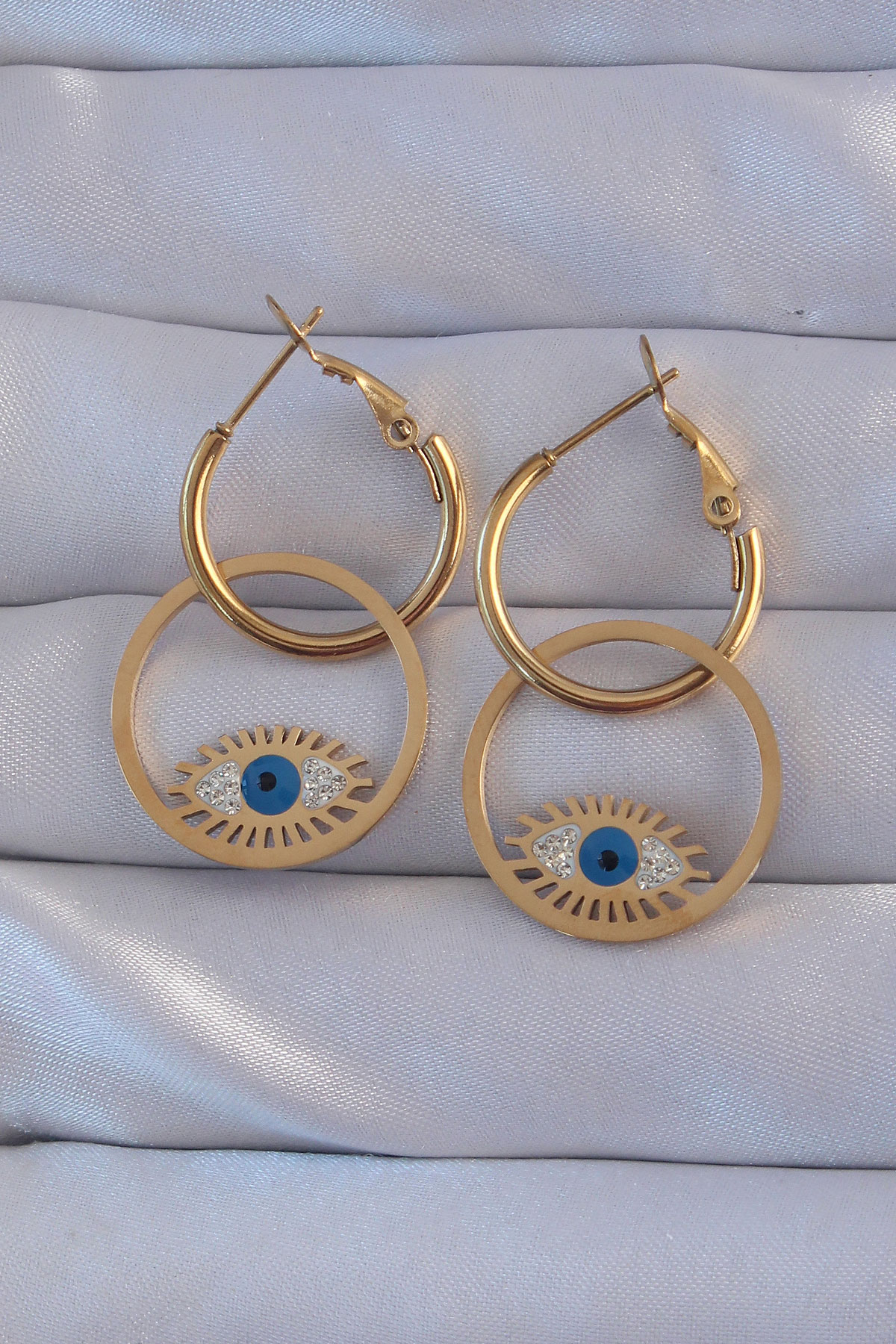 316L Çelik Gold Renk Zirkon Taşlı Mavi Göz Tasarımlı Halka Küpe