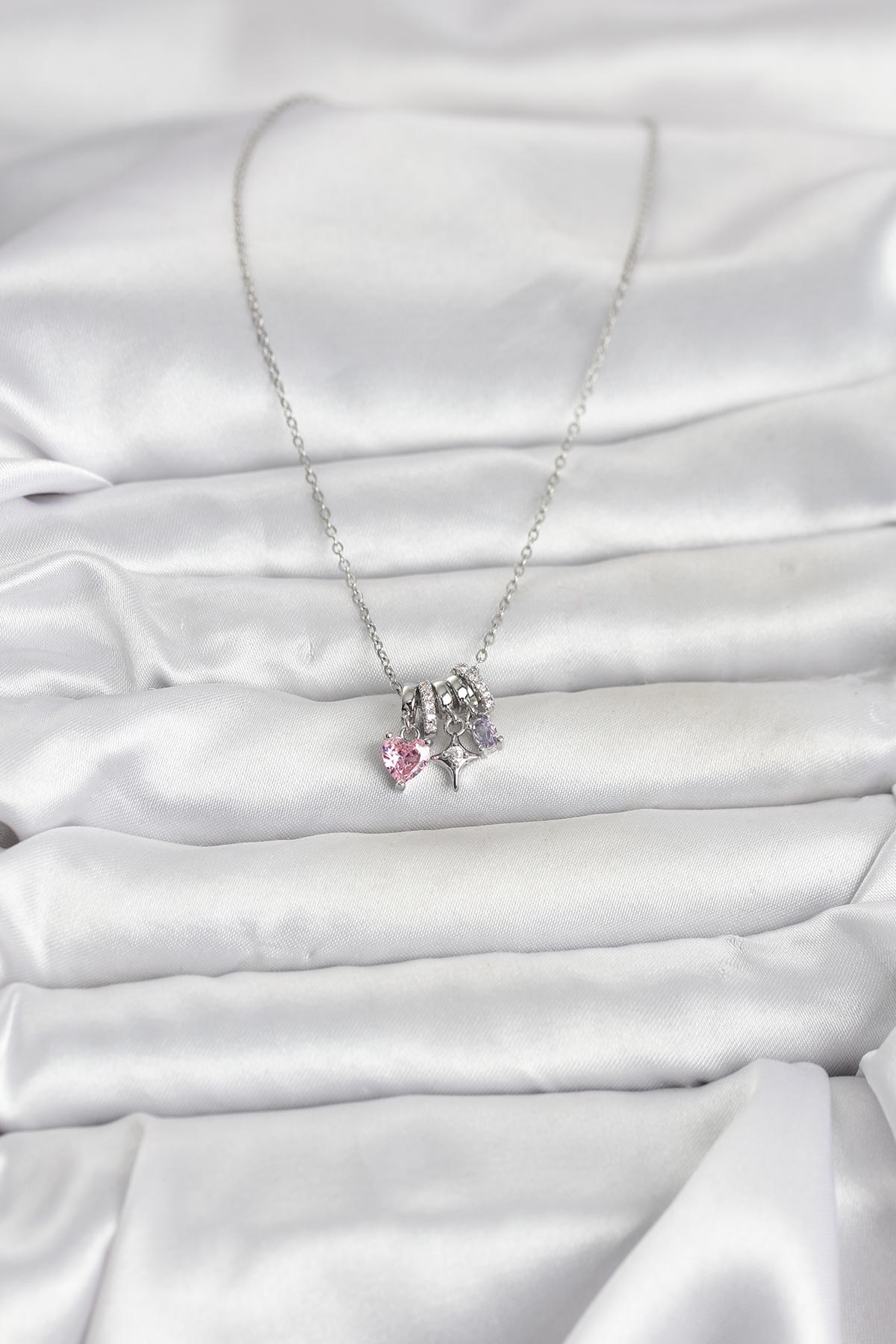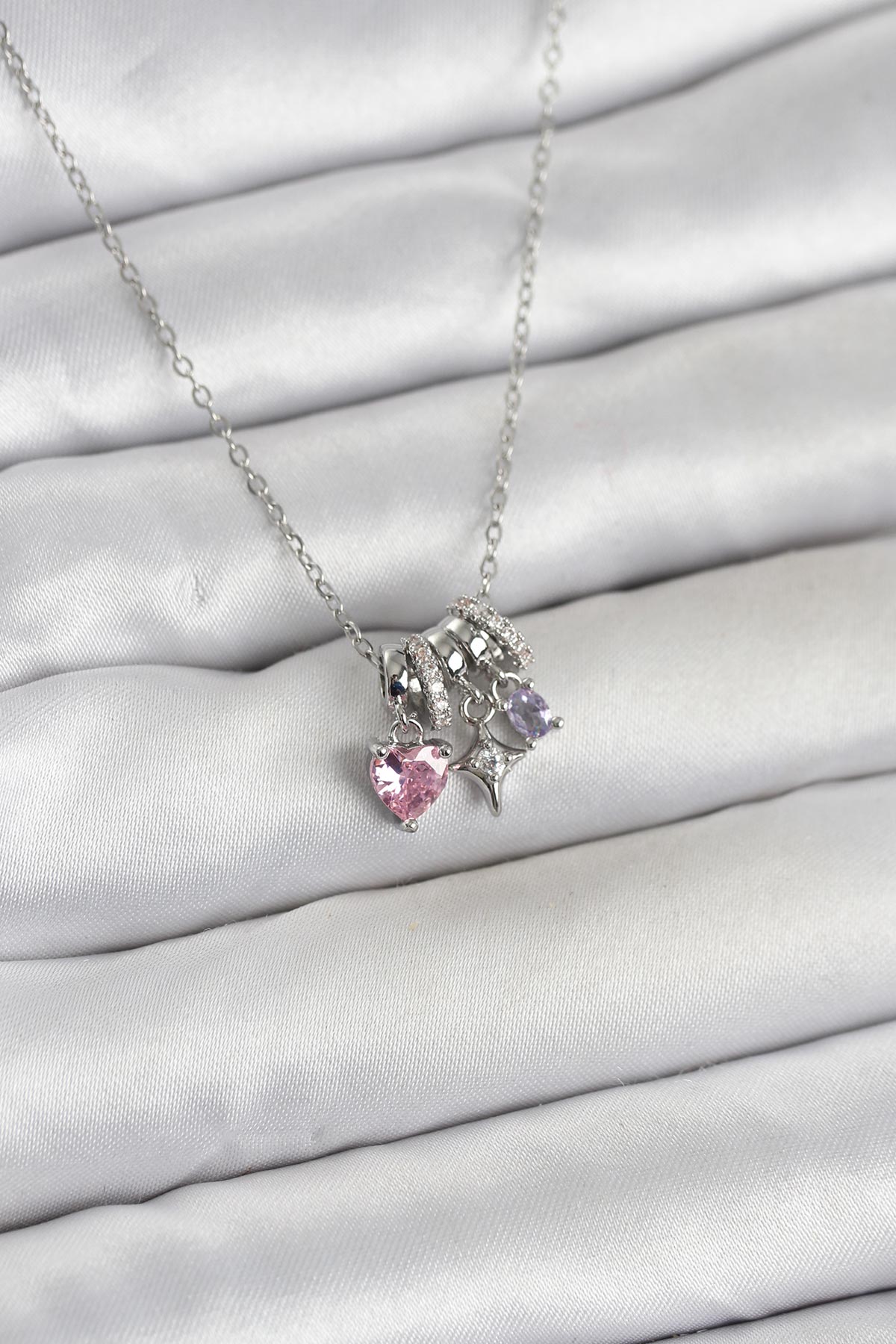316L Çelik Gümüş Pembe Zirkon Taşlı Charmlı Kadın Kolye
