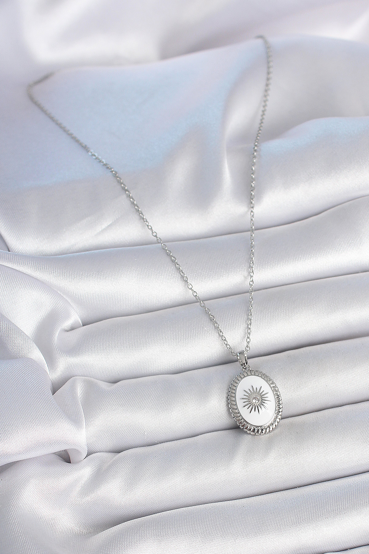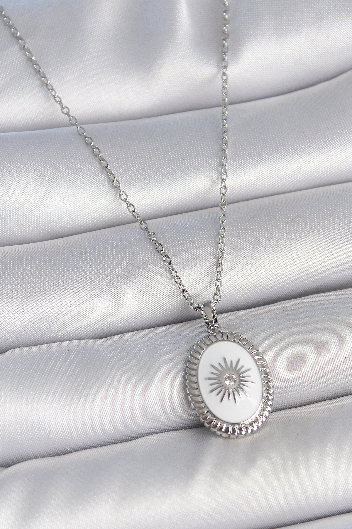 316L Çelik Gümüş Renk Beyaz Mineli Güneş İşlemeli Nazar Boncuk Detay Madalyon Model Kadın Kolye