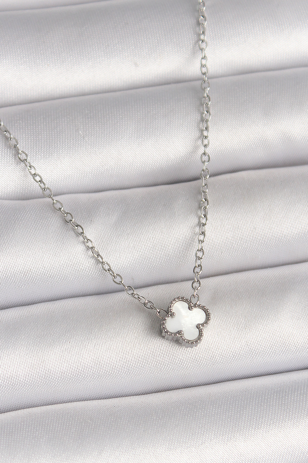 316L Çelik Gümüş Renk Beyaz Yonca Model Kadın Kolye