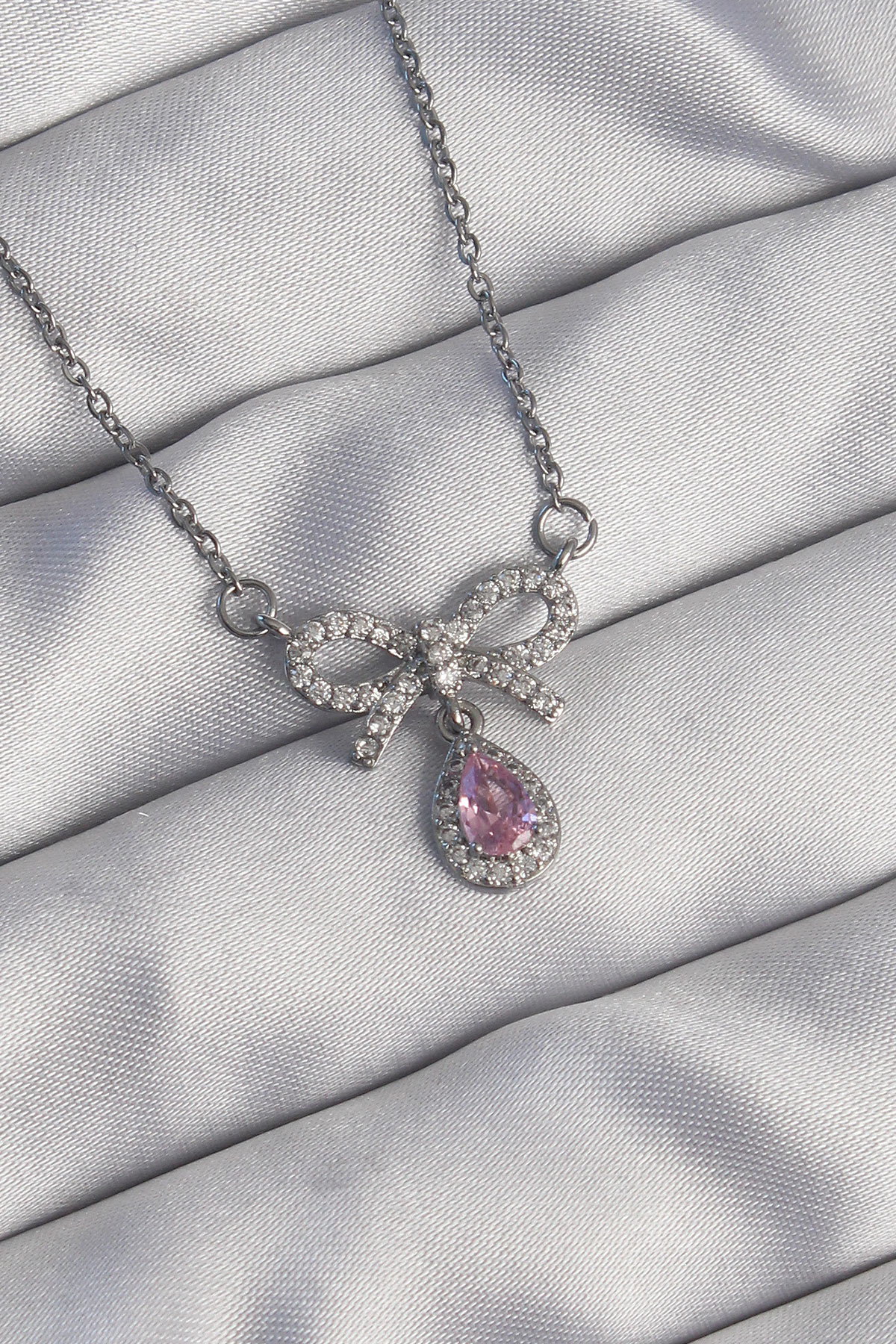 316L Çelik Gümüş Renk Fiyonk Detay Pembe Zirkon Taşlı Damla Kolye
