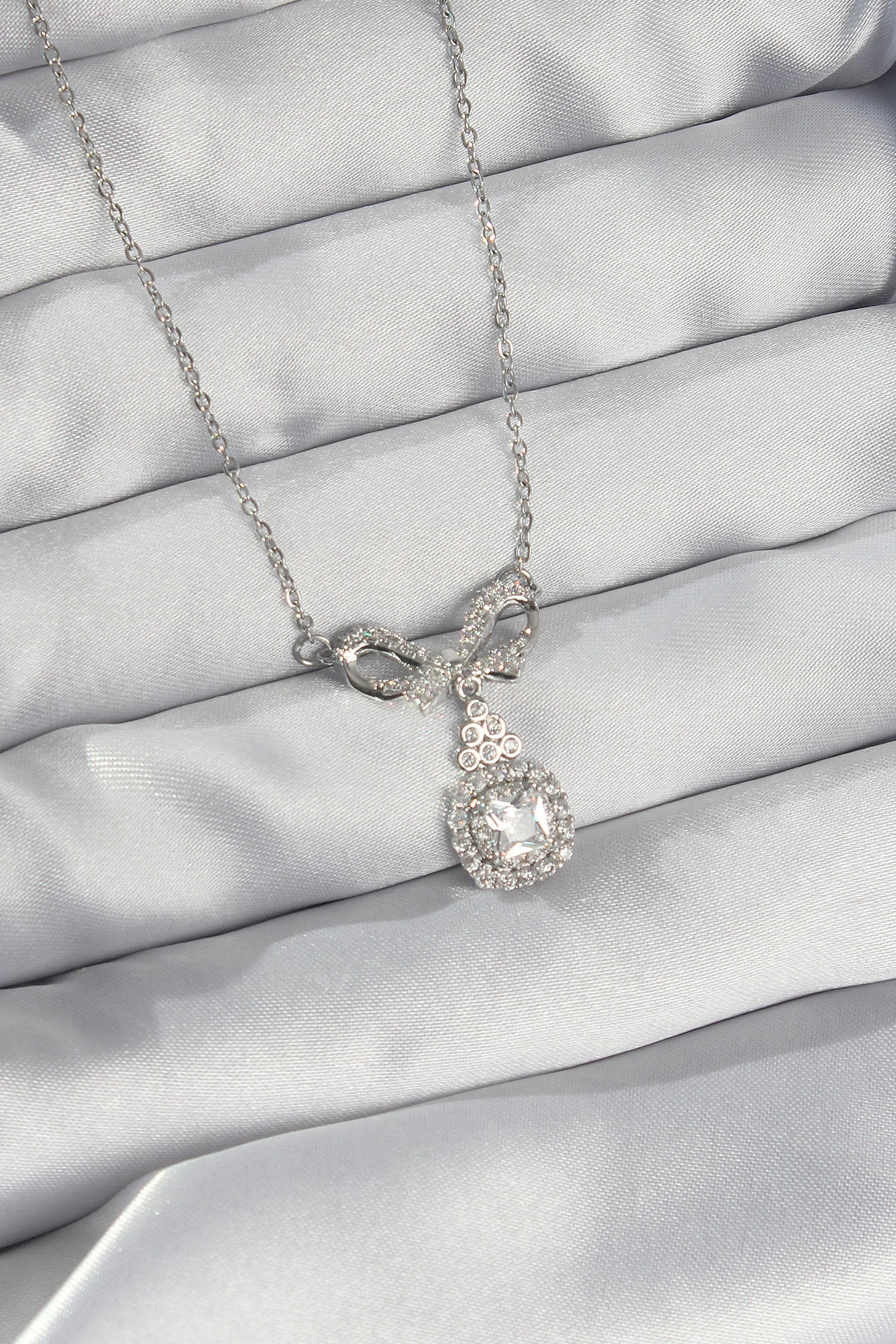 316L Çelik Gümüş Renk Fiyonk Detay Zirkon Taşlı Tektaş Kolye