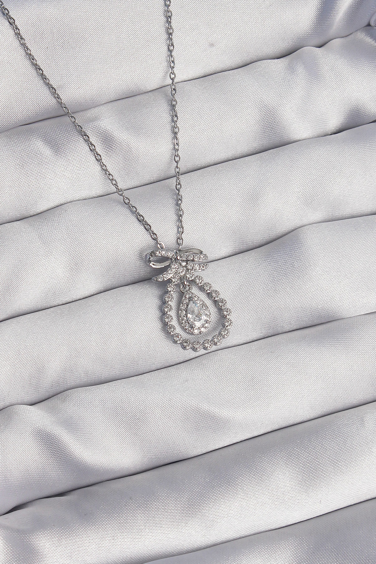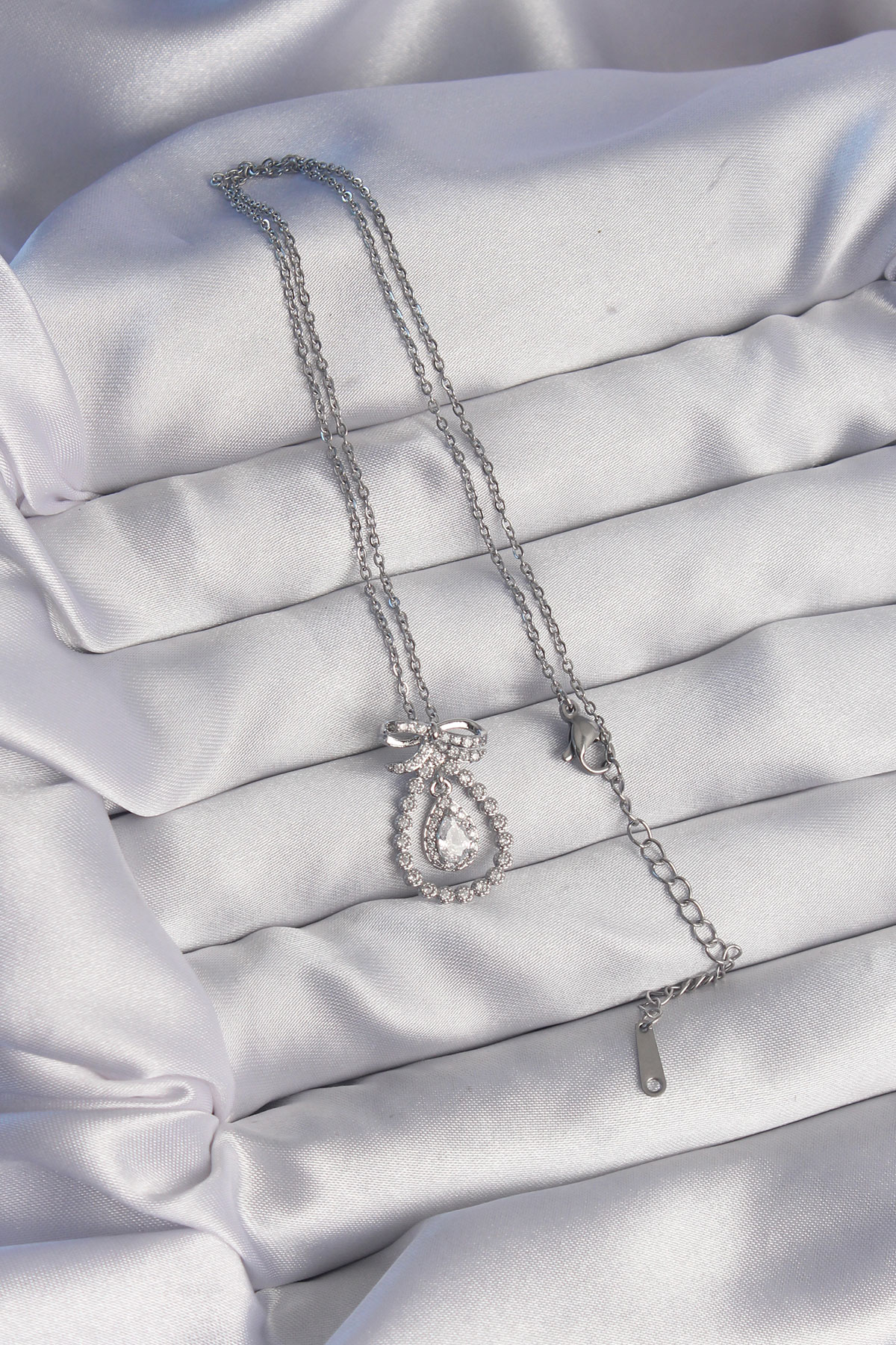 316L Çelik Gümüş Renk Fiyonk Detaylı Zirkon Taşlı Damla Model Kolye