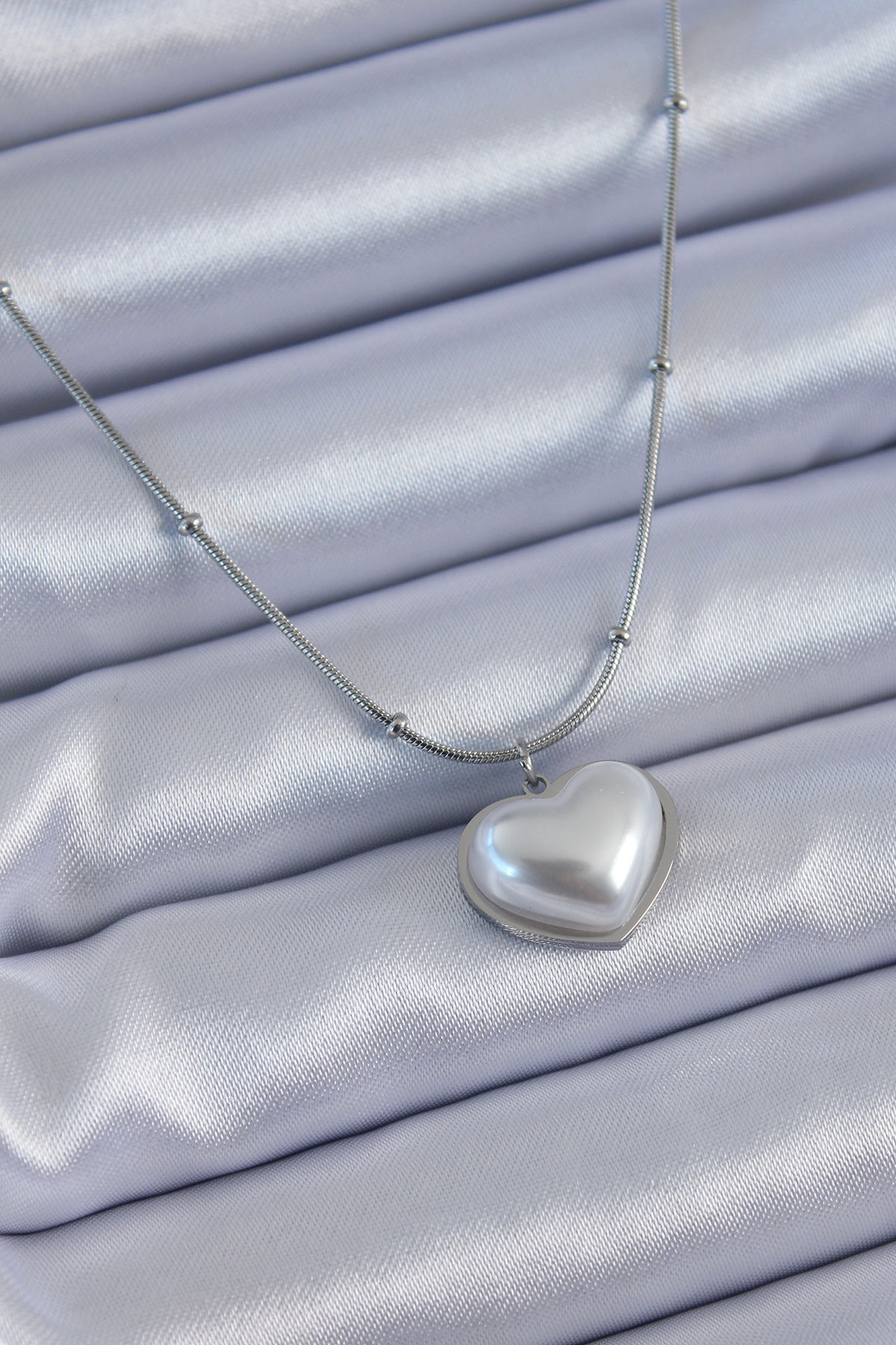 316L Çelik Gümüş Renk İncili Kalp Model Minimal Top Detay Kadın Kolye