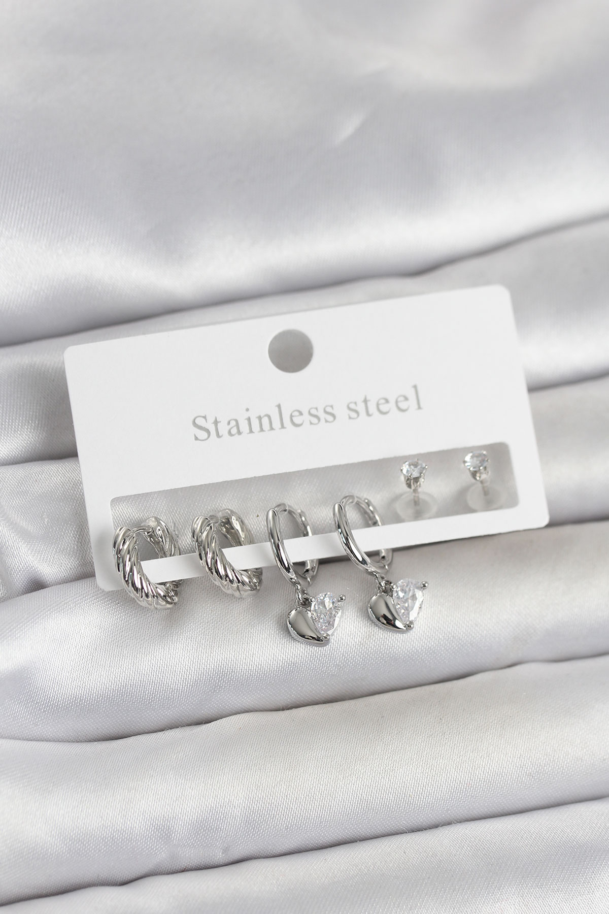 316L Çelik Gümüş Renk Kalp Detaylı Kadın Küpe Seti