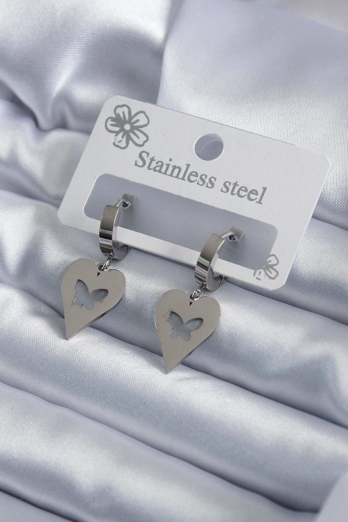 316L Çelik Gümüş Renk Kalp Model Kelebek İşleme Kadın Küpe