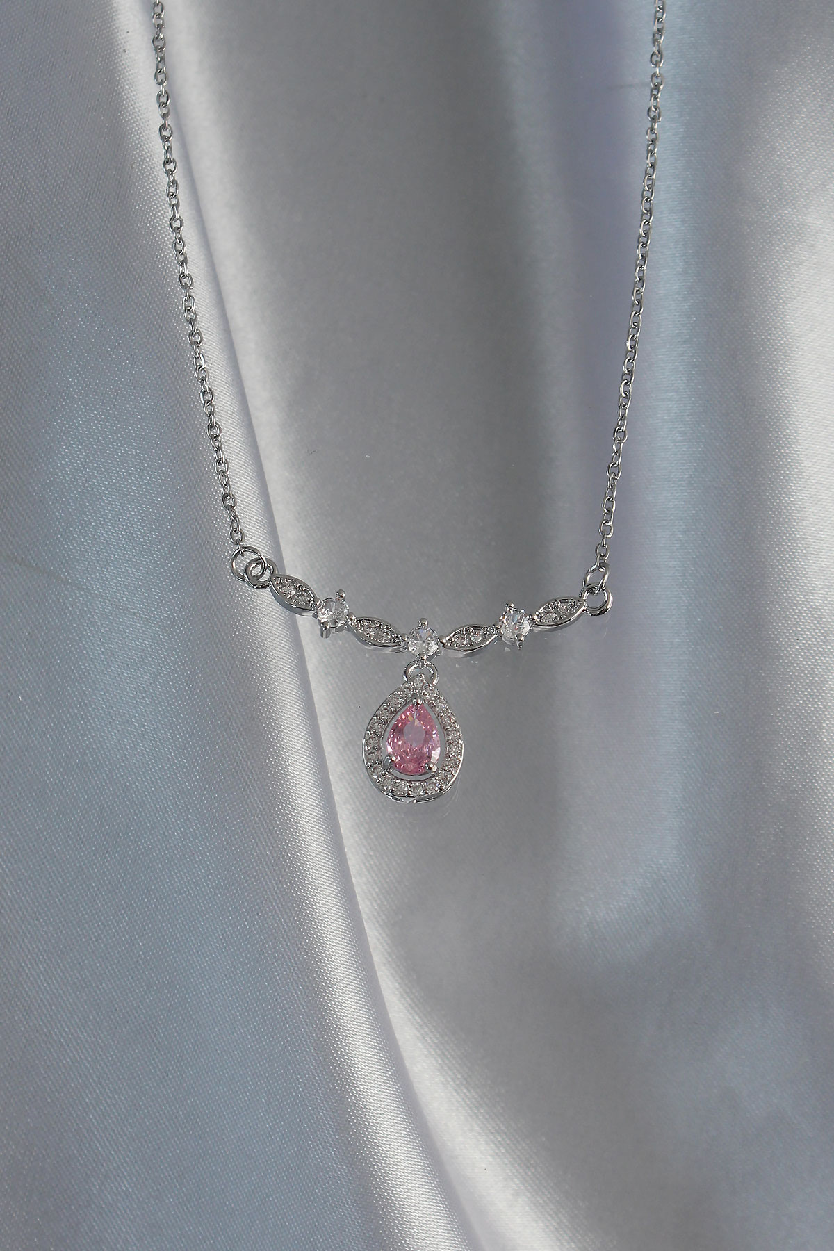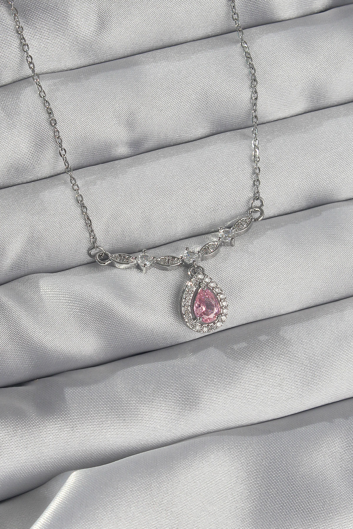 316L Çelik Gümüş Renk Pembe Zirkon Taşlı Damla Kolye