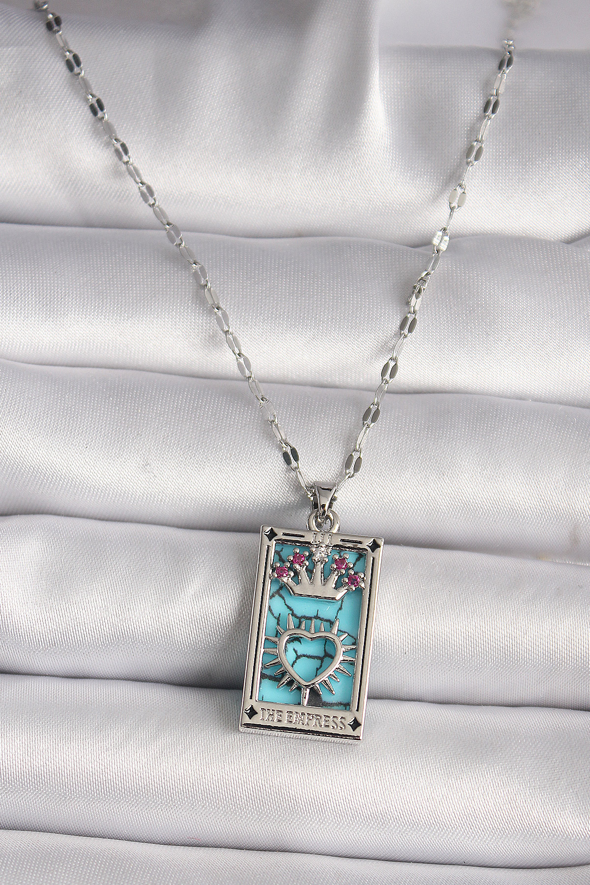 316L Çelik Gümüş Renk Pembe Zirkon Taşlı Taç Kalp Portre Model Kadın Kole