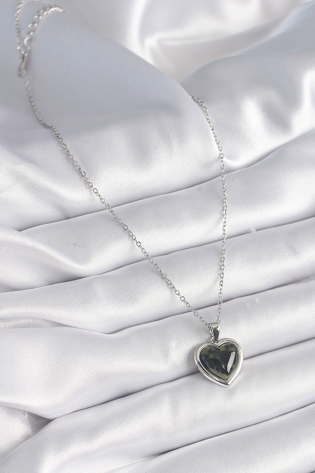 316L Çelik Gümüş Renk Yeşil Mineli Kalp Model Kadın Kolye
