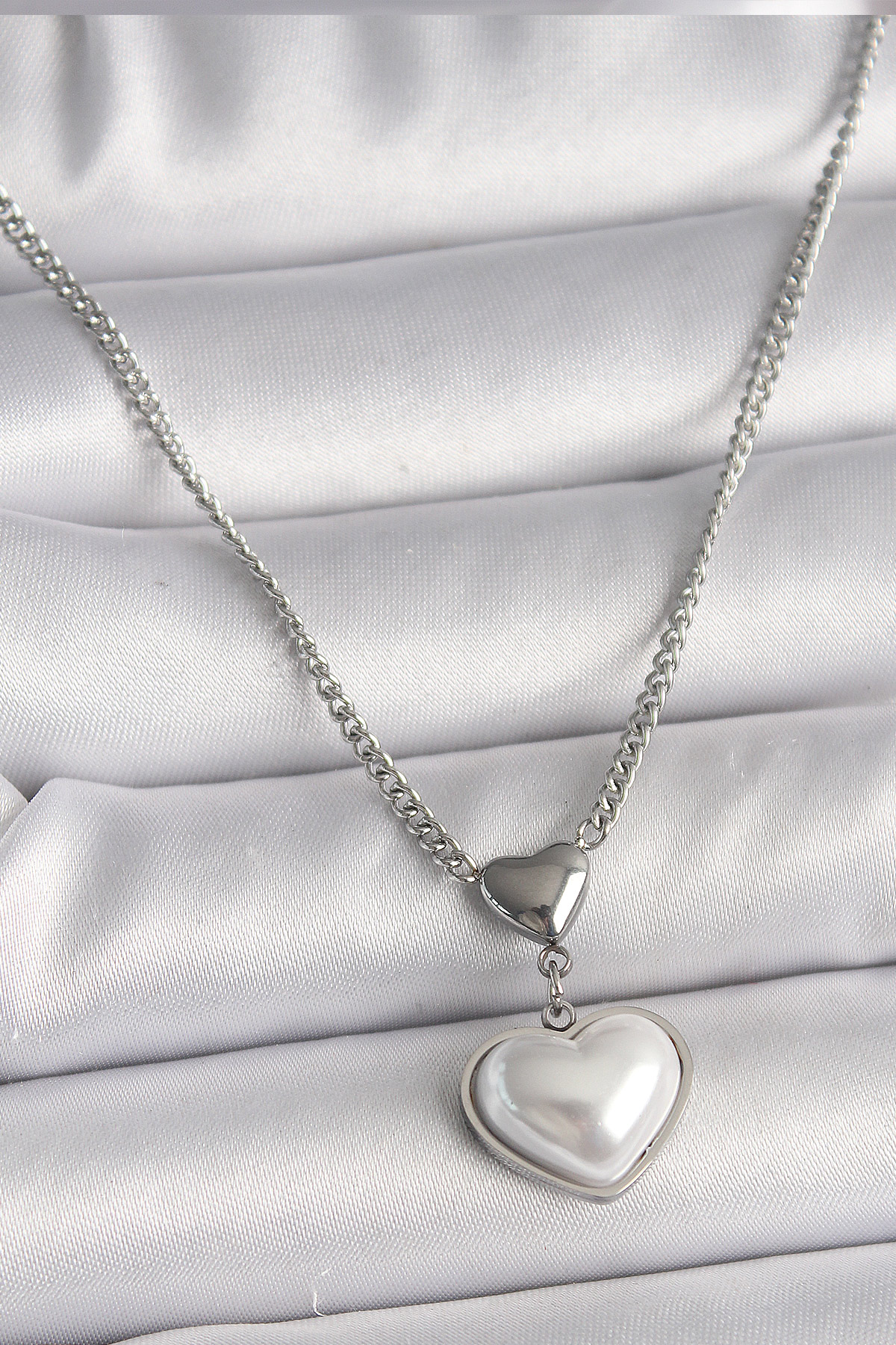 316L Çelik Gümüş Renk Zincir 3D Kalp Model Kadın Kolye