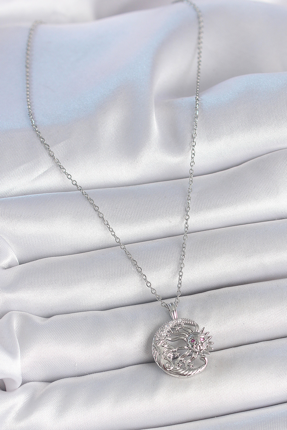 316L Çelik Gümüş Renk Zincir Ay Güneş Model Zirkon Taş Detay Kadın Kolye