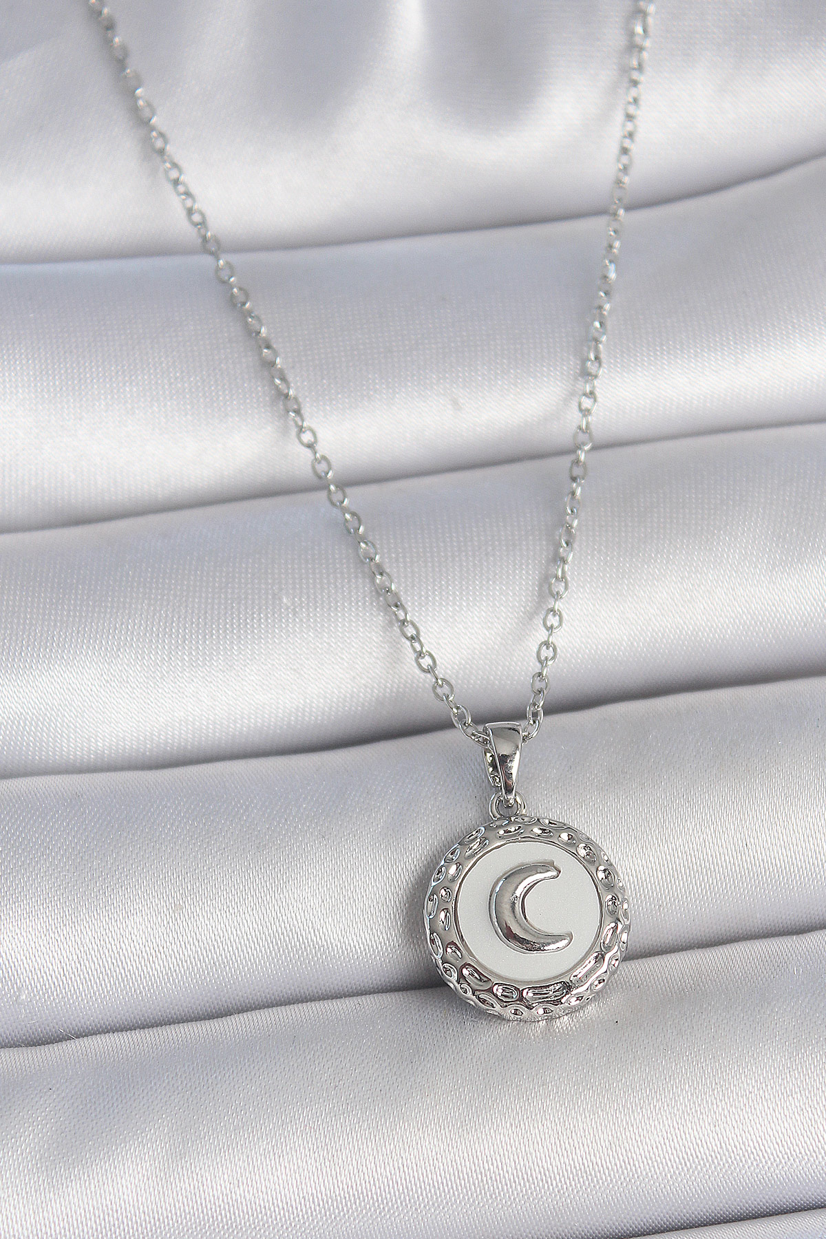 316L Çelik Gümüş Renk Zincir Beyaz Mineli Hilal İşlemeli Madalyon Model Kadın Kolye