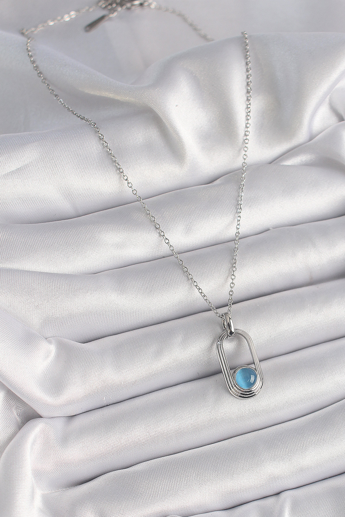 316L Çelik Gümüş Renk Zincir Mavi Kedi Göz Model Kadın Kolye