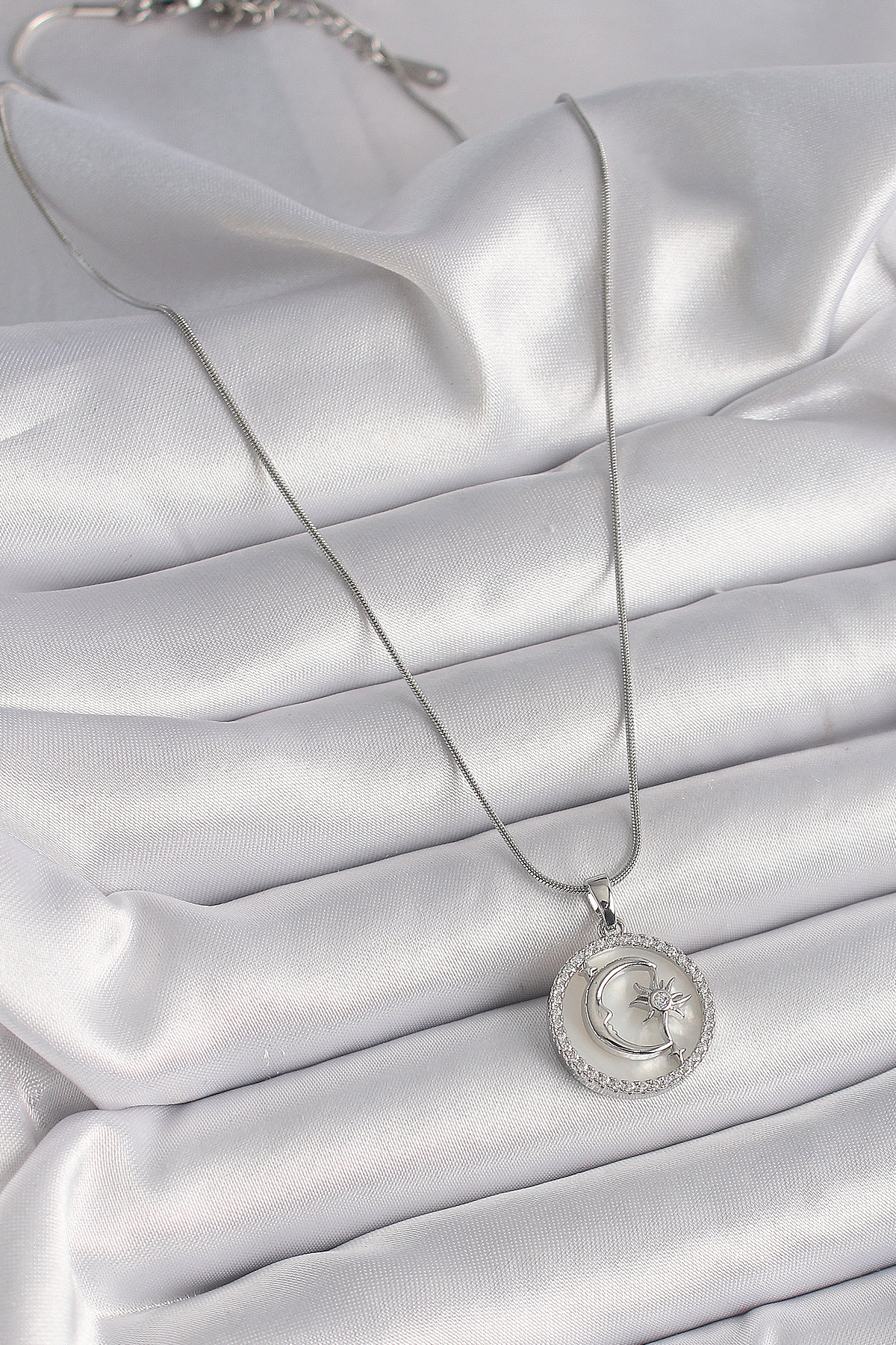 316L Çelik Gümüş Renk Zincir Zirkon Taş Detaylı Beyaz Sedefli Ay Yıldız İşleme Kadın Kolye