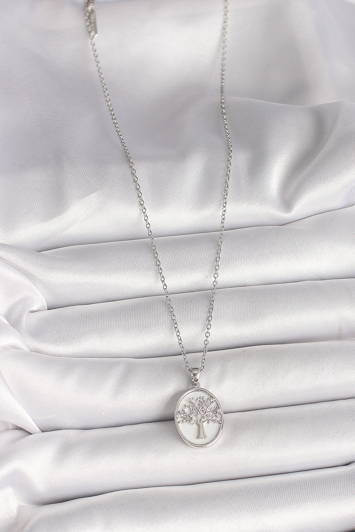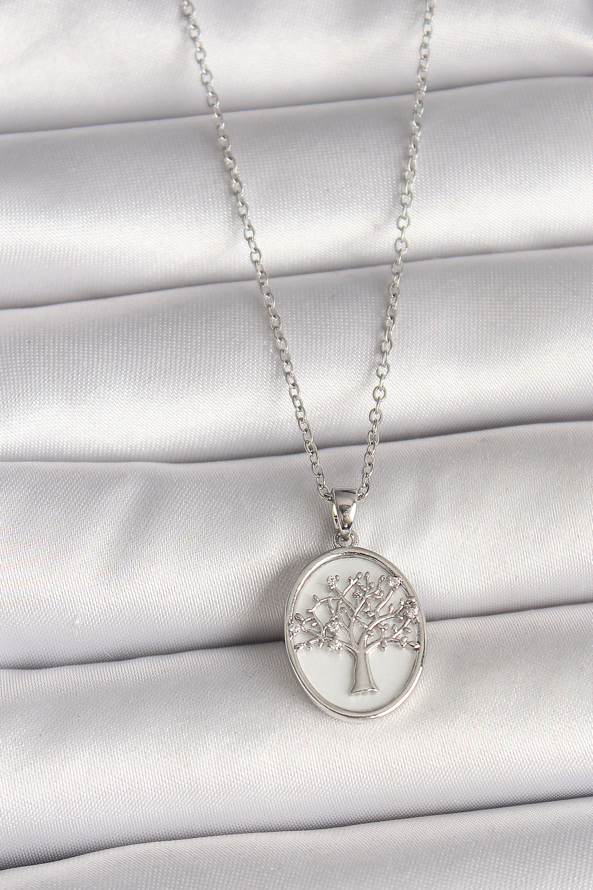 316L Çelik Gümüş Renk Zincir Zirkon Taş İşlemeli Beyaz Mineli Ağaç İşlemeli Portre Model Kadın Kolye