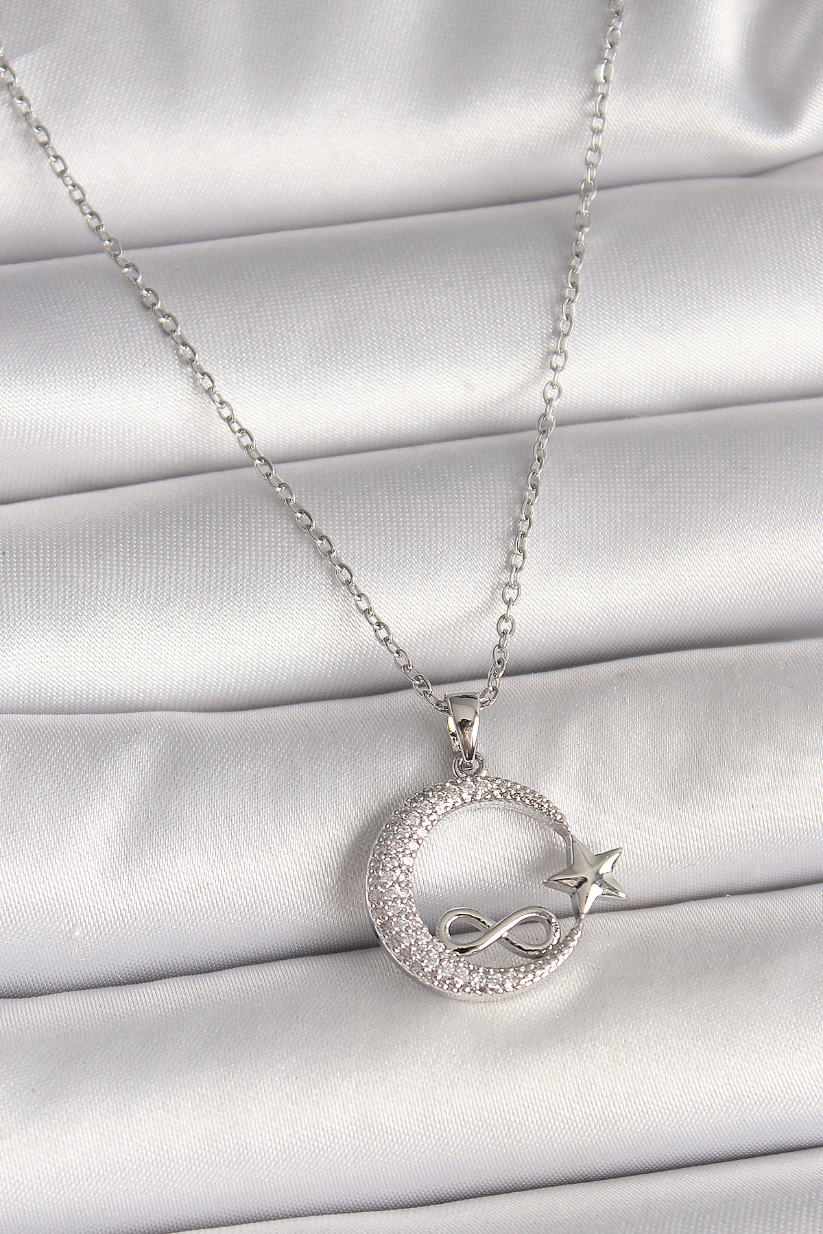 316L Çelik Gümüş Renk Zincir Zirkon Taşlı Ay Yıldız Model Sonsuzluk Detay Kadın Kolye