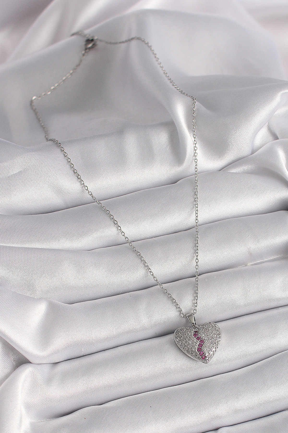 316L Çelik Gümüş Renk Zincir Zirkon Taşlı Kalp Model Kadın Kolye
