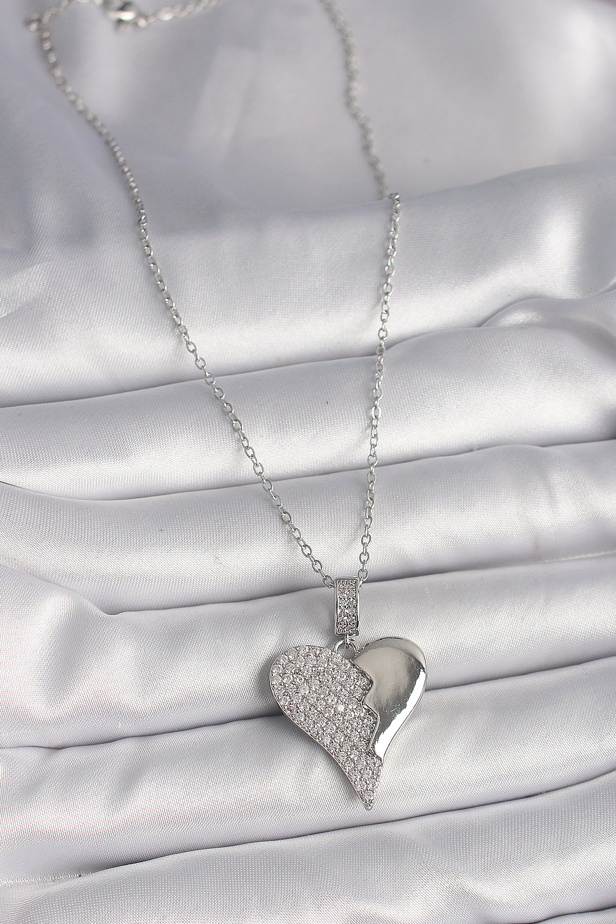 316L Çelik Gümüş Renk Zincir Zirkon Taşlı Kırık Kalp Model Kadın Kolye