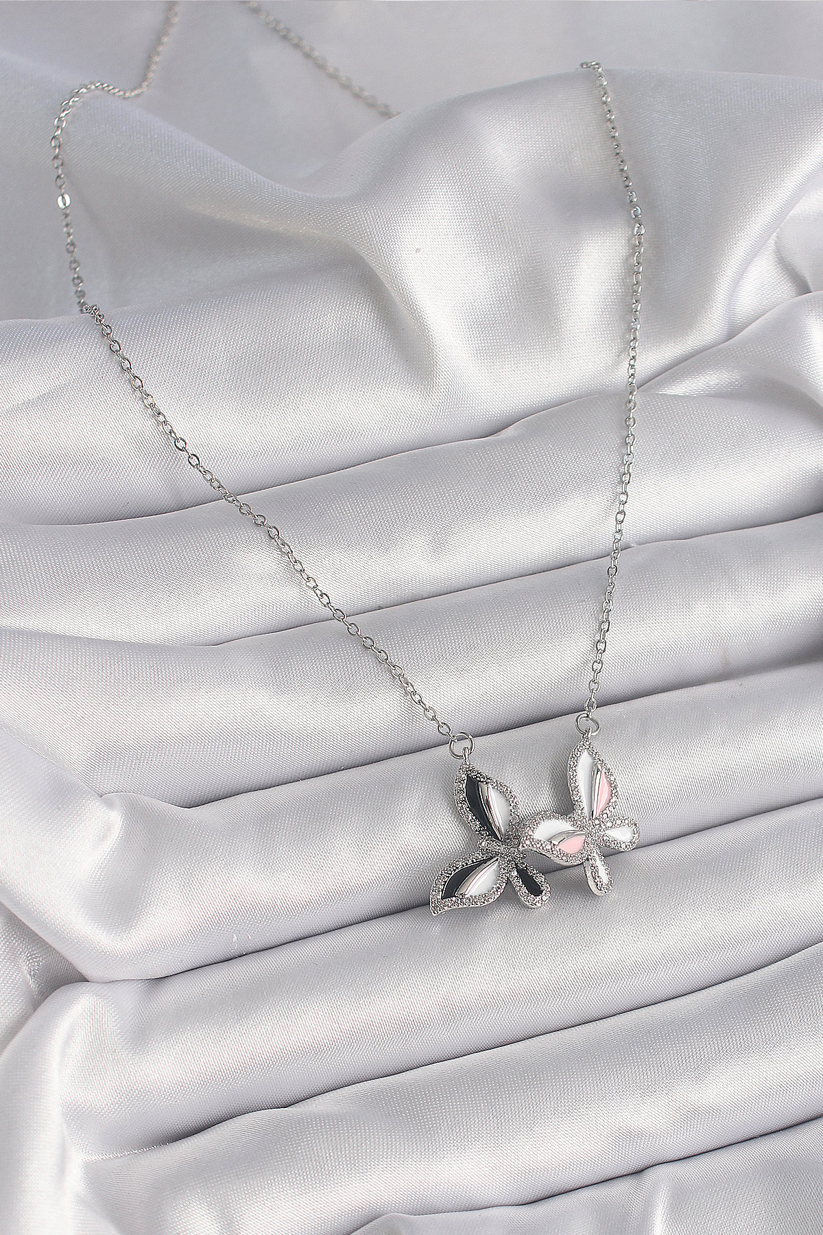 316L Çelik Gümüş Renk Zincir Zirkon Taşlı Renkli Kelebek Model Kadın Kolye