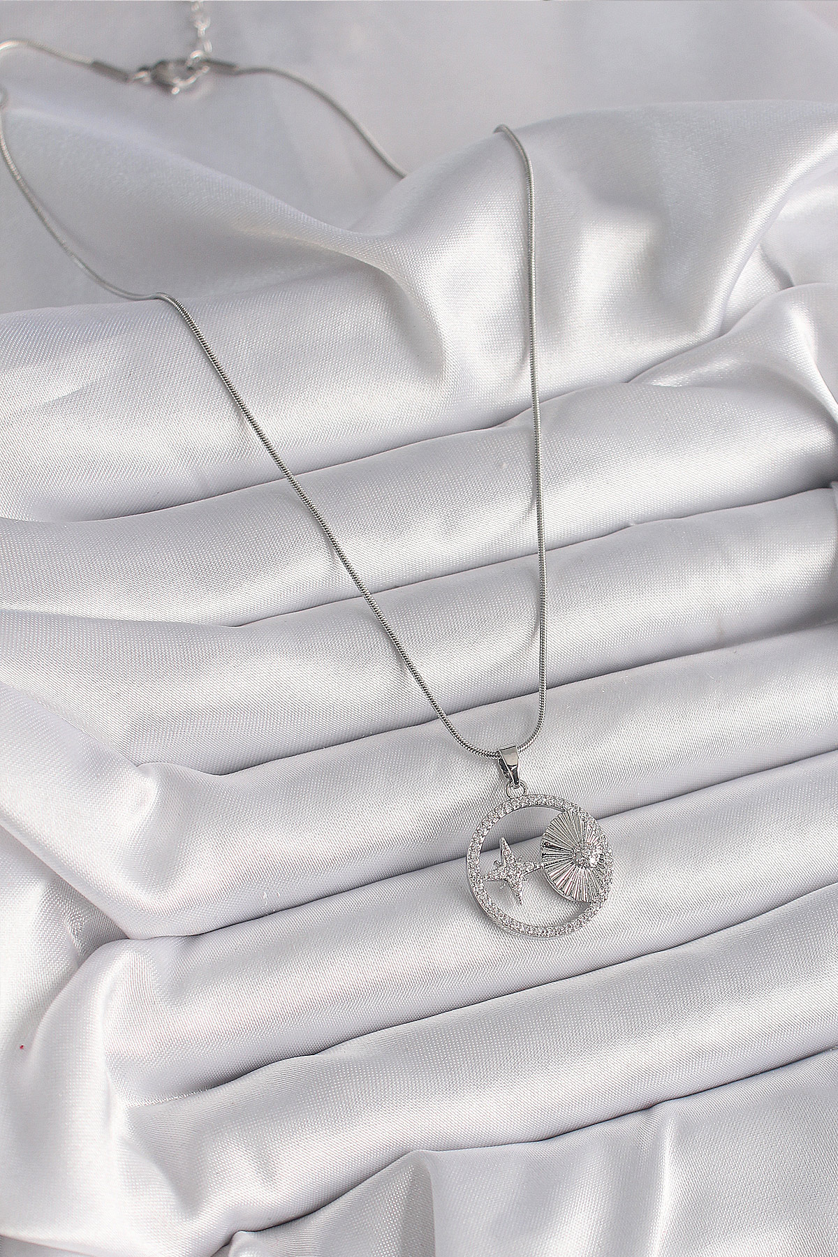 316L Çelik Gümüş Renk Zincir Zirkon Taşlı Yıldız Madalyon Model Kadın Kolye