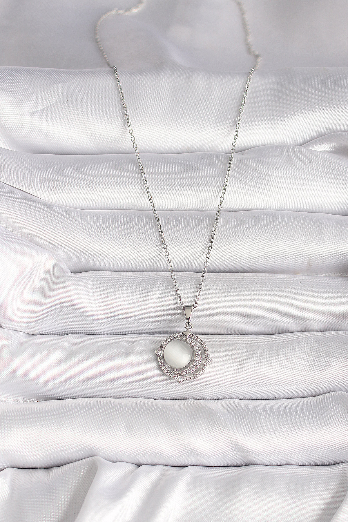 316L Çelik Gümüş Renk Zirkon Taşlı Beyaz Sedefli Hilal Model Kadın Kolye