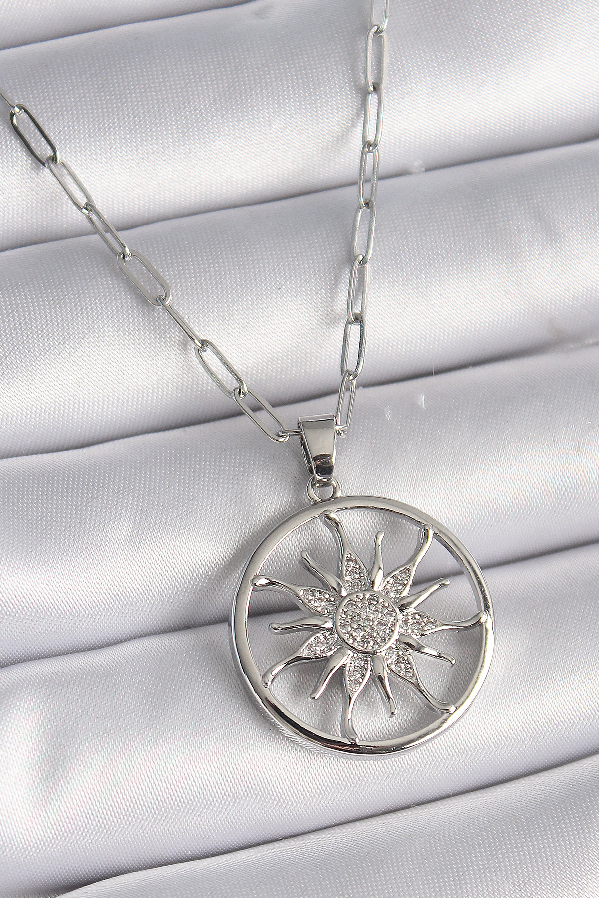 316L Çelik Gümüş Renk Zirkon Taşlı Güneş Madalyon Model Kadın Kolye