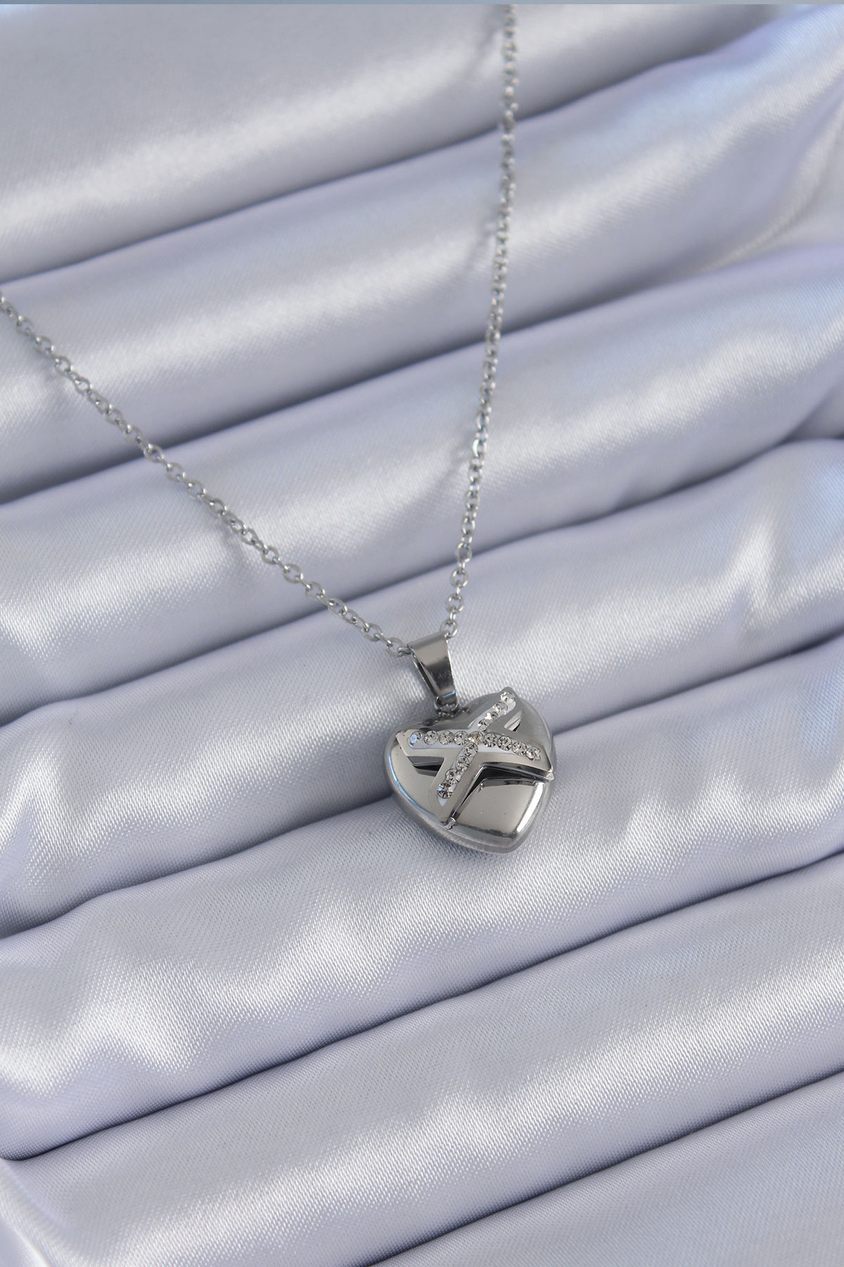 316L Çelik Gümüş Renk Zirkon Taşlı Kalp Model Kadın Kolye
