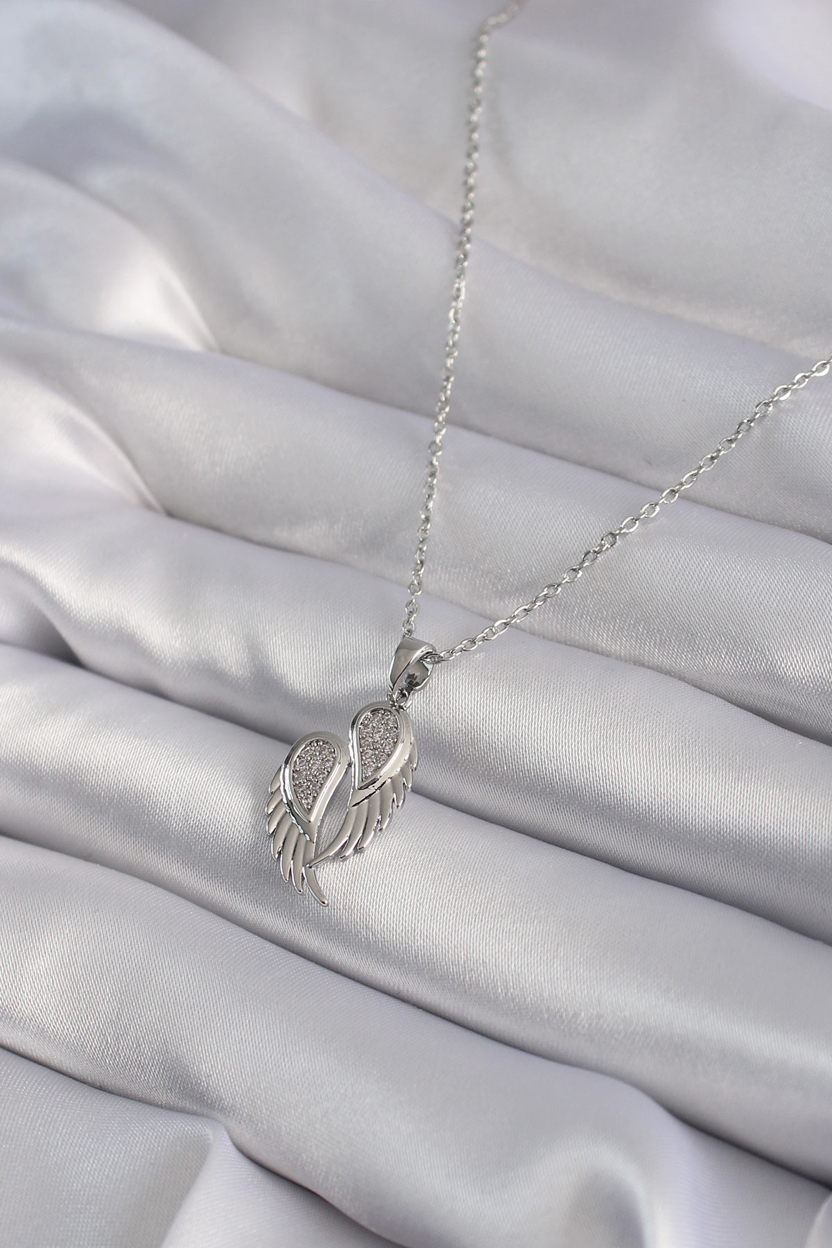 316L Çelik Gümüş Renk Zirkon Taşlı Kanat Model Kadın Kolye