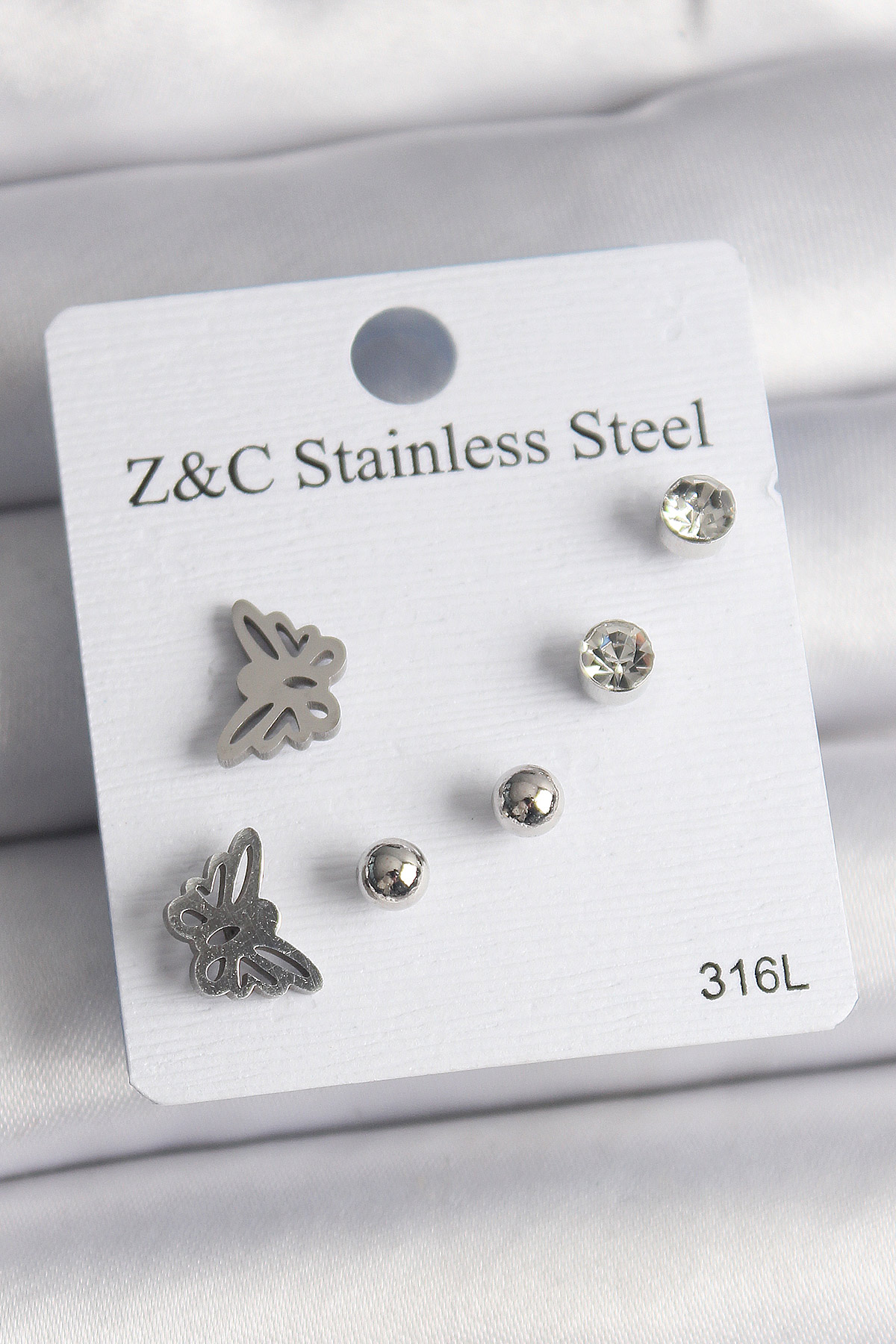 316L Çelik Gümüş Renk Zirkon Taşlı Kelebek Model Kadın Küpe Seti