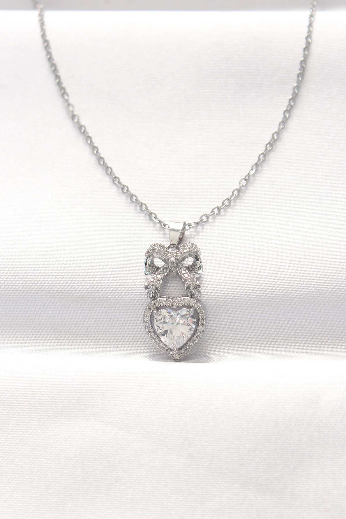 316L Çelik Silver Renk Zirkon Taşlı Kalpli Fiyonk Kolye