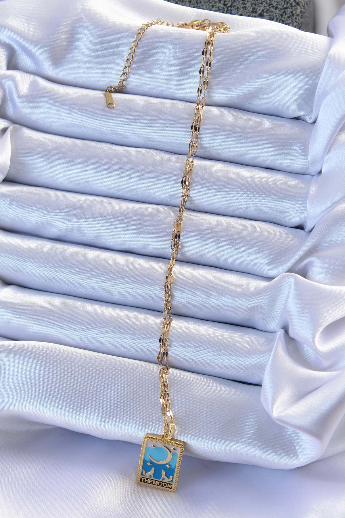 316L Çelik Zincir Altın Renk Mavi Mineli Ay Figür Tarot Kolye