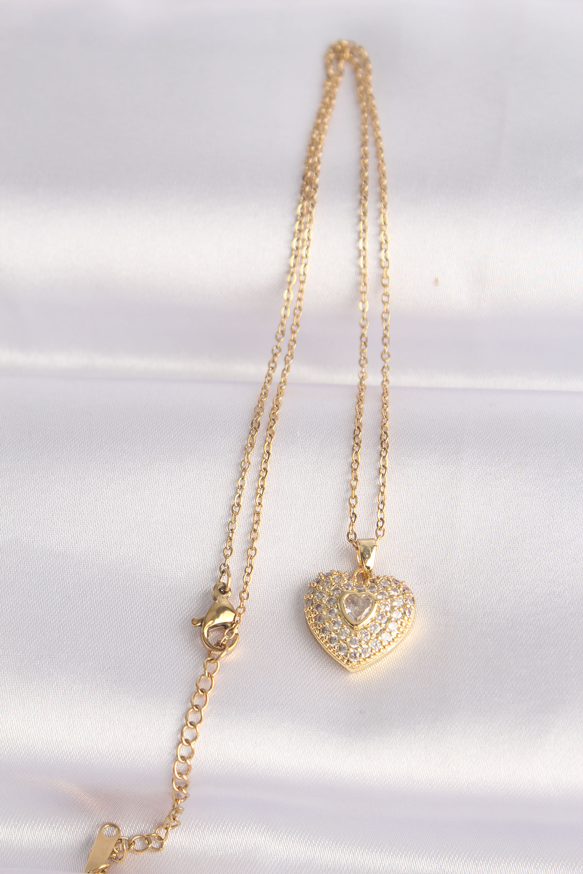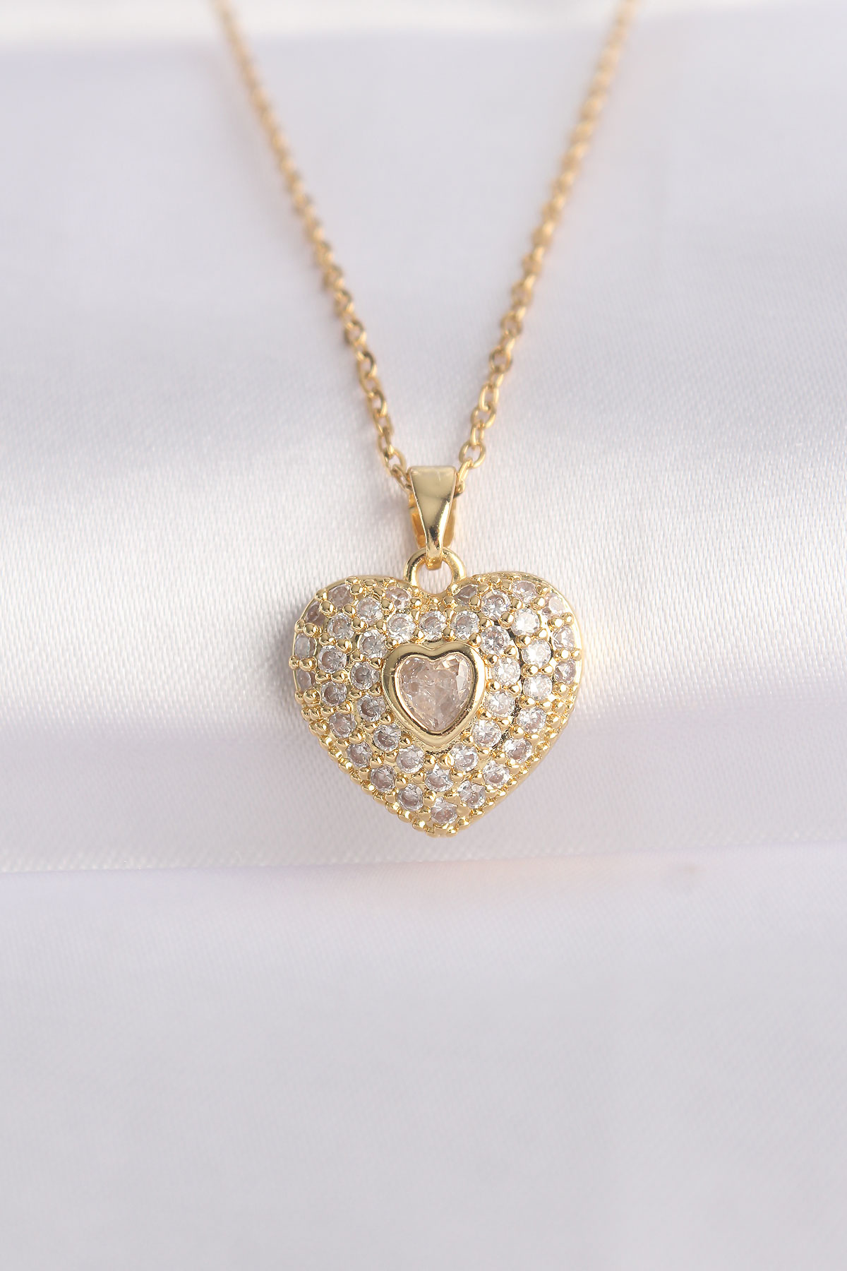 316L Çelik Zincir Altın Renk Zirkon Taşlı Kalp Kolye