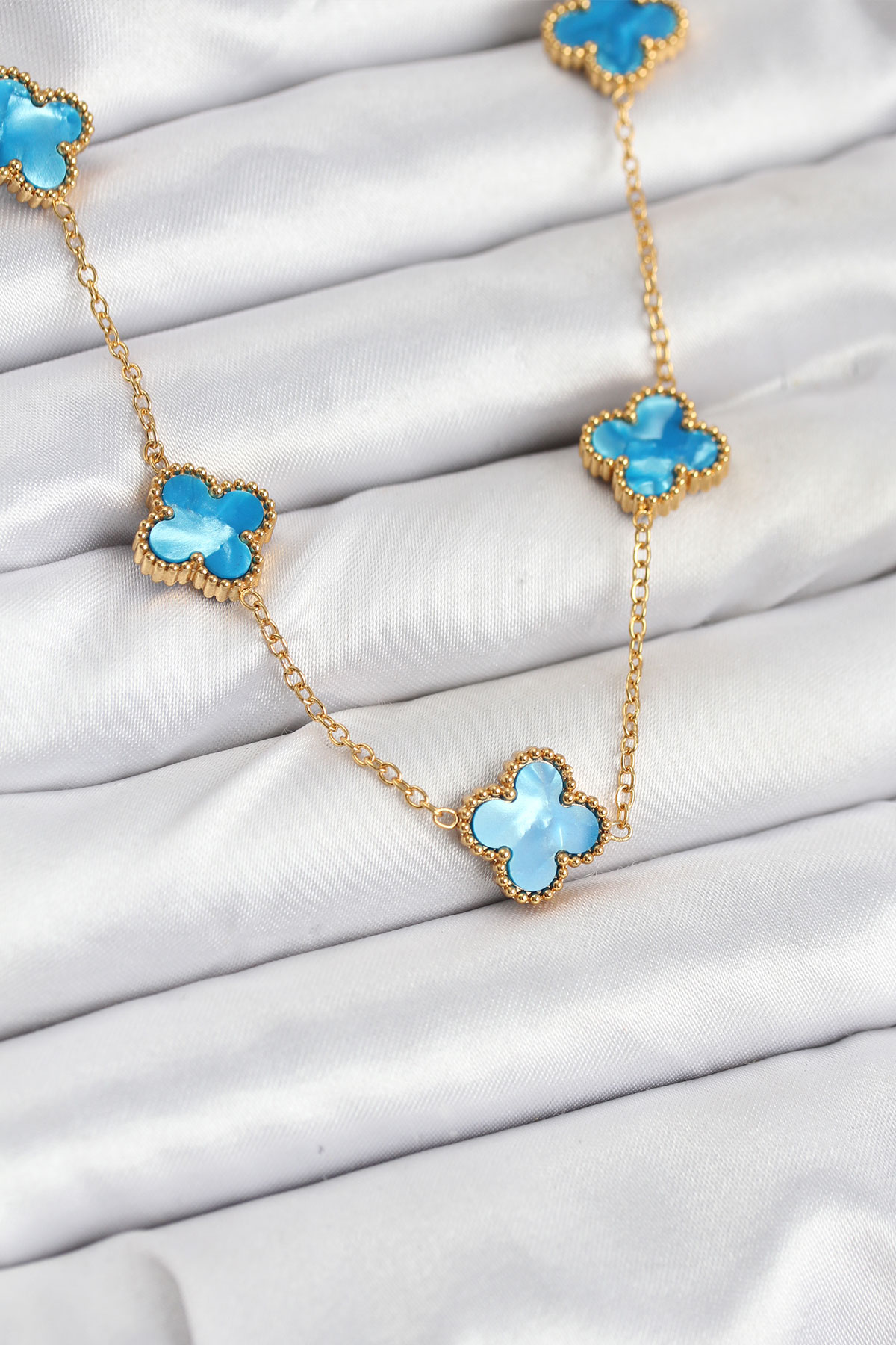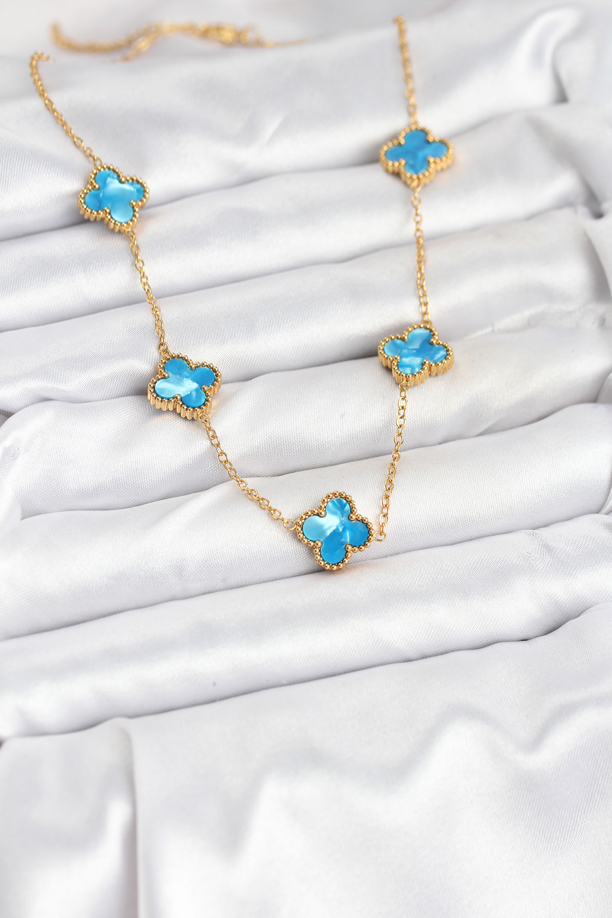 316L Çelik Zincir Gold Buz Mavisi Renk Yonca Kolye