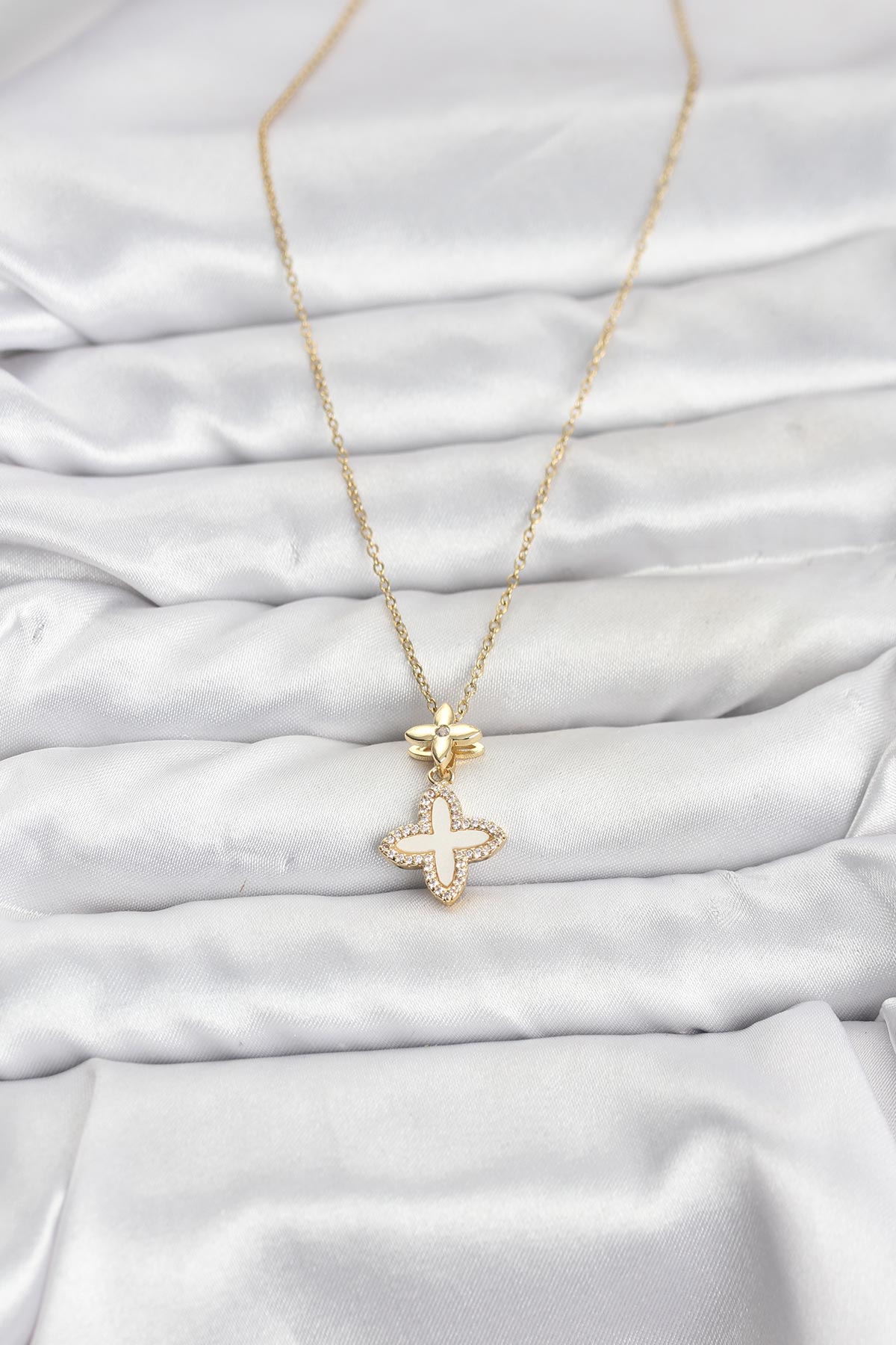 316L Çelik Zincir Gold Renk 4 Yapraklı Yonca Model Zirkon Taşlı Kadın Kolye