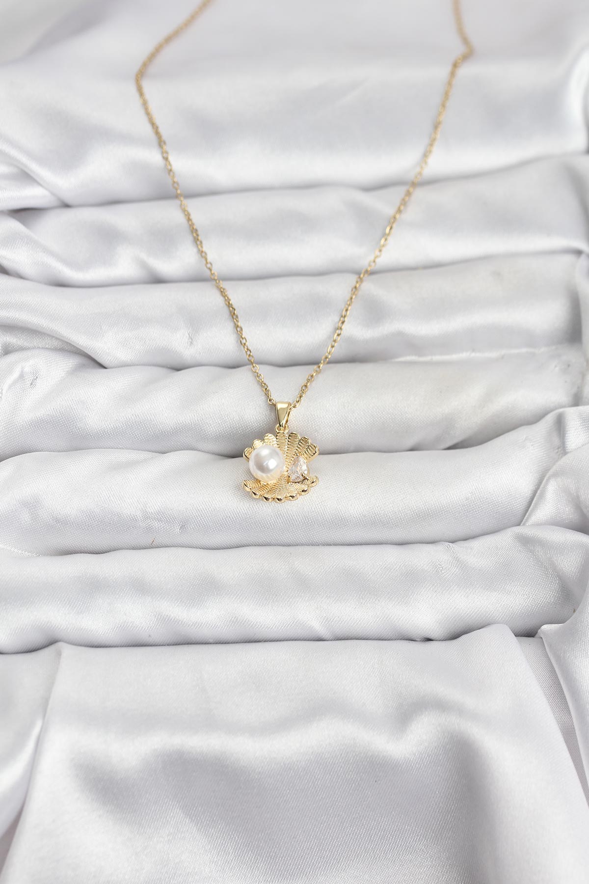 316L Çelik Zincir Gold Renk İstiridye İnci Model Zirkon Taşlı Kadın Kolye